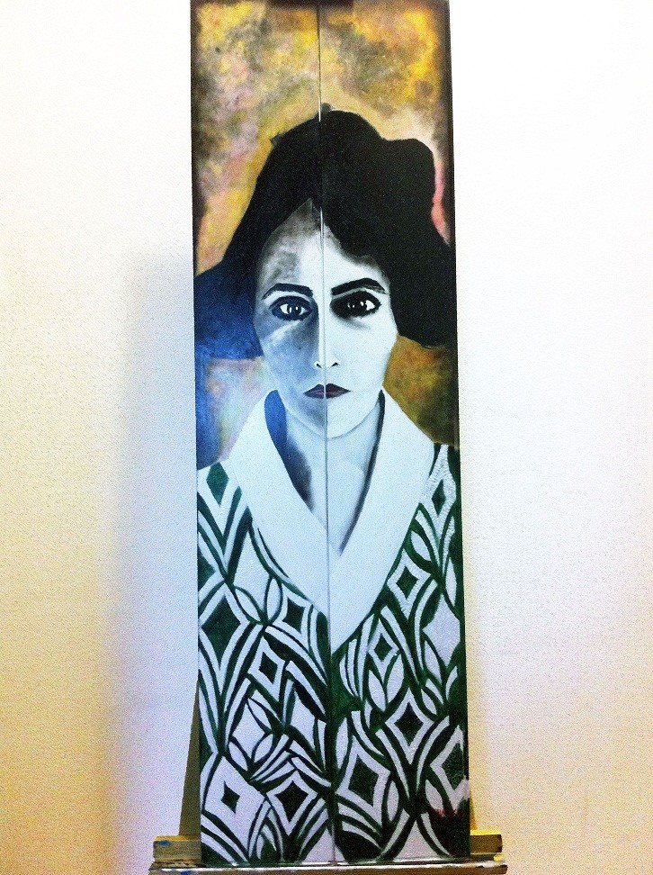 Portrait de Gala Dali, realisé à Paris février 2013. Acrylic et huile sur bois.Portrait diptyque.Robe verte et blanc, car elle s"est marrié pour la première fois en vert. 130X40cm. Ce tableau fait parti de la série "La Beauté des souffrances".