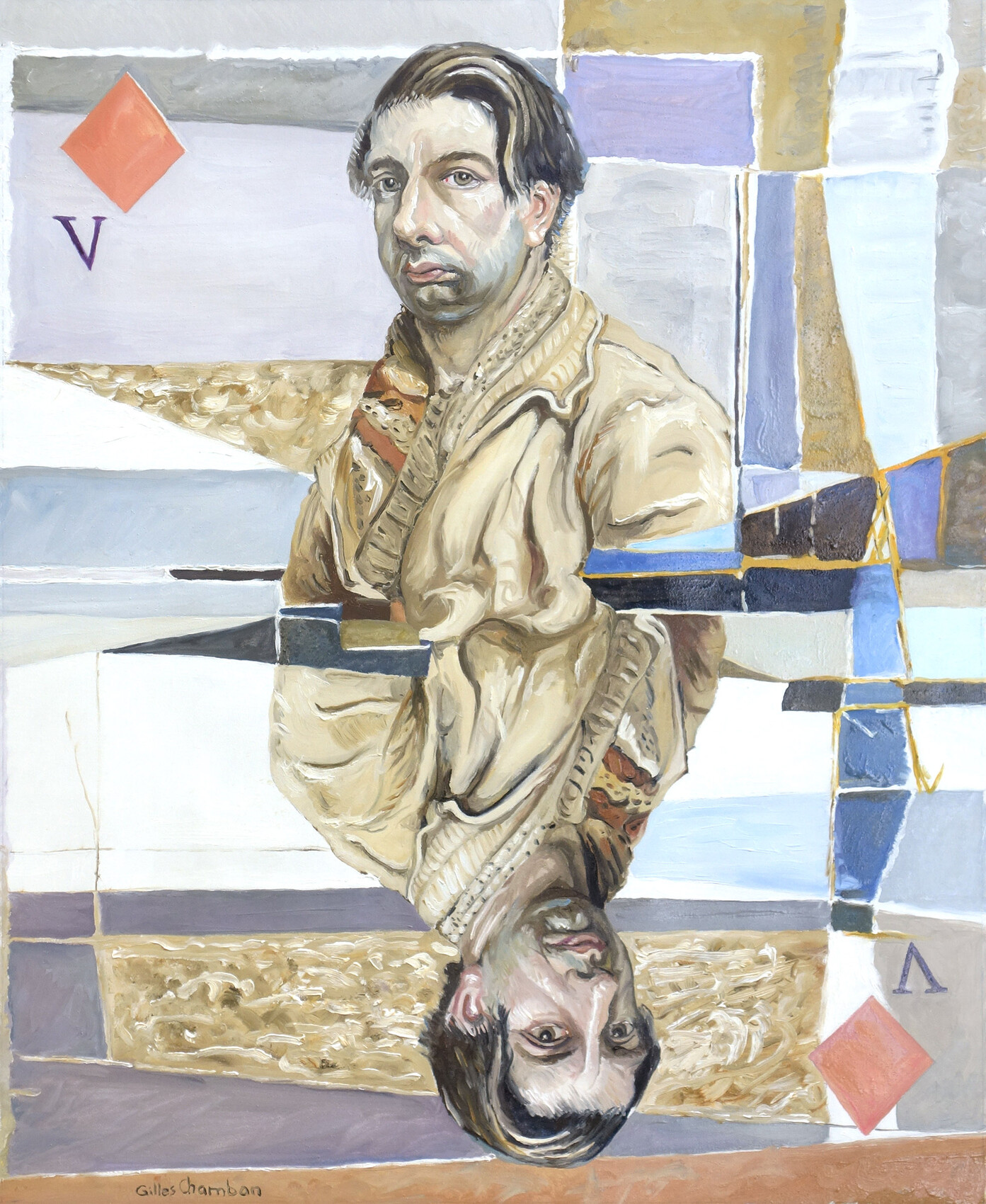 HST 61 x 50 cm, 2020. Giorgio de Chirico, l’un des peintres qui m’a le plus marqué, est mon valet de carreau. J’ai choisi ici un autoportrait de 1925 (G.N.M, Rome), dans lequel on devine l’influence qu’il a pu avoir sur Magritte. Je l’ai associé à une composition de James Guitet, dont la géométrie évoque un miroir brisé ou un kaléidoscope : le peintre qui se représente ne brise-t-il pas le miroir, ouvrant l’image réfléchie sur mille évocations mystérieuses ?