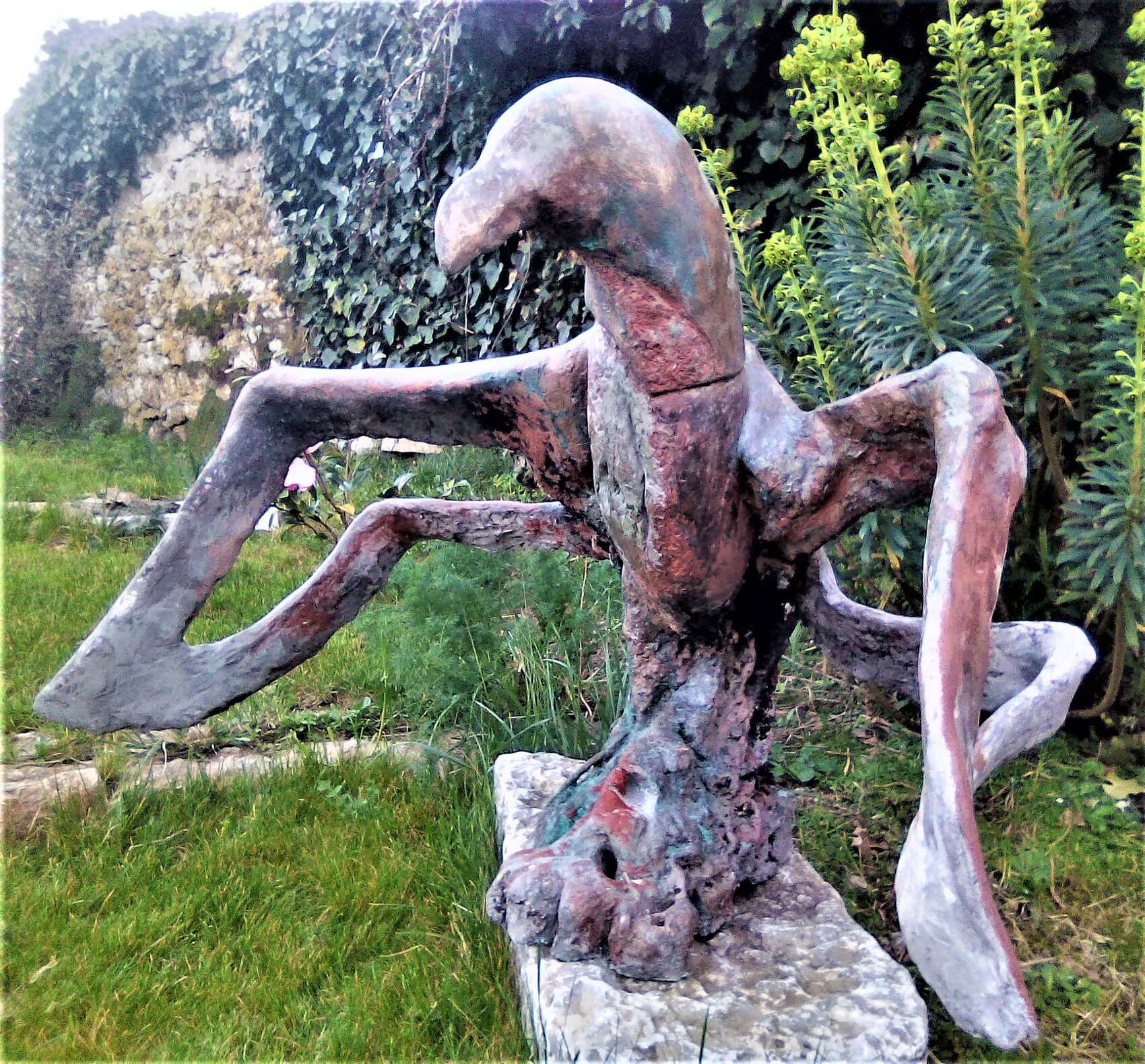 Pas mal de matériaux différents : grillage à poule, contreplaqué, carton, ciment teinté, colle à carrelage, fil de fer, racines, peinture, métal à froid, etc. Envergure : 1,30 m.