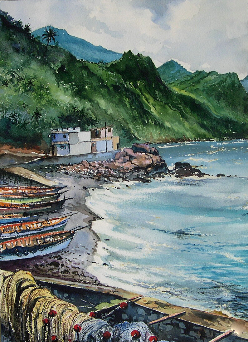 Petit port de pêche au nord de la Martinique. Aquarelle.