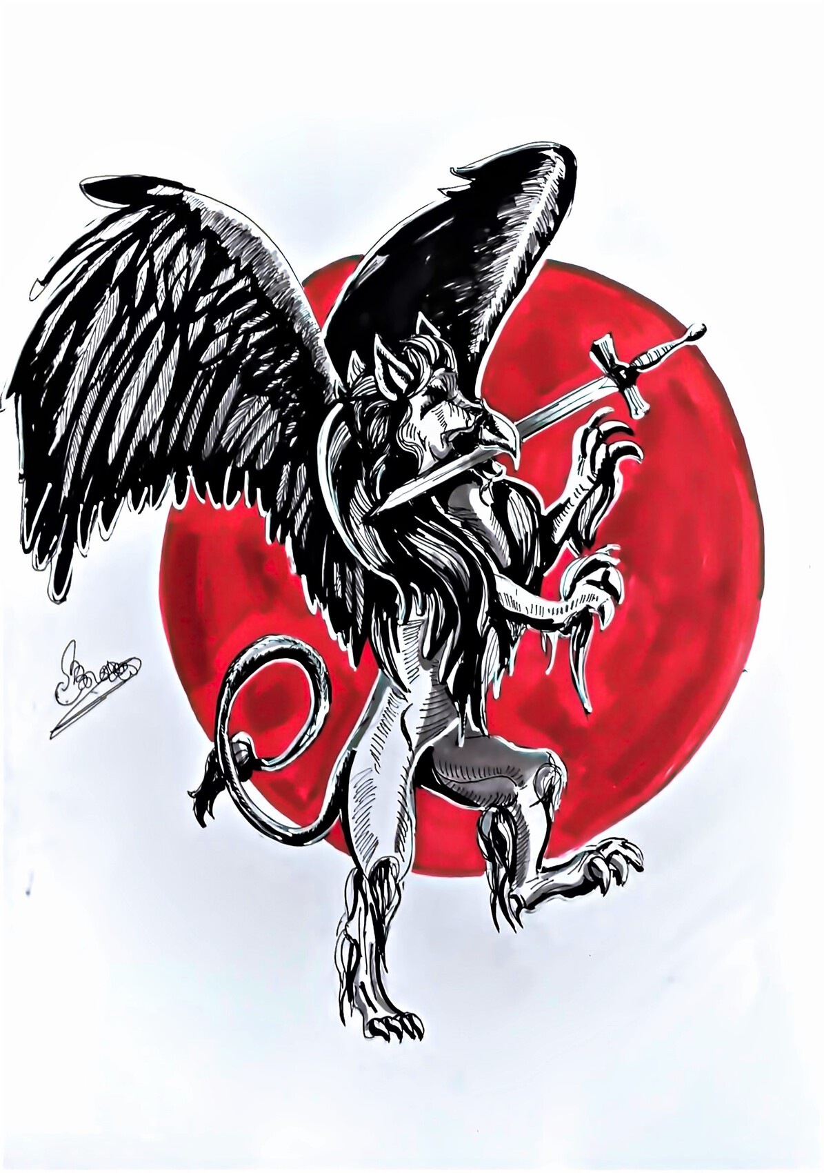 Combien d'écus cette chimère n'a-t'elle pas orné? Cette fois, c'est le griffon qui porte les armes. Beau dessin, moderne, de cette créature mythique très ancienne.