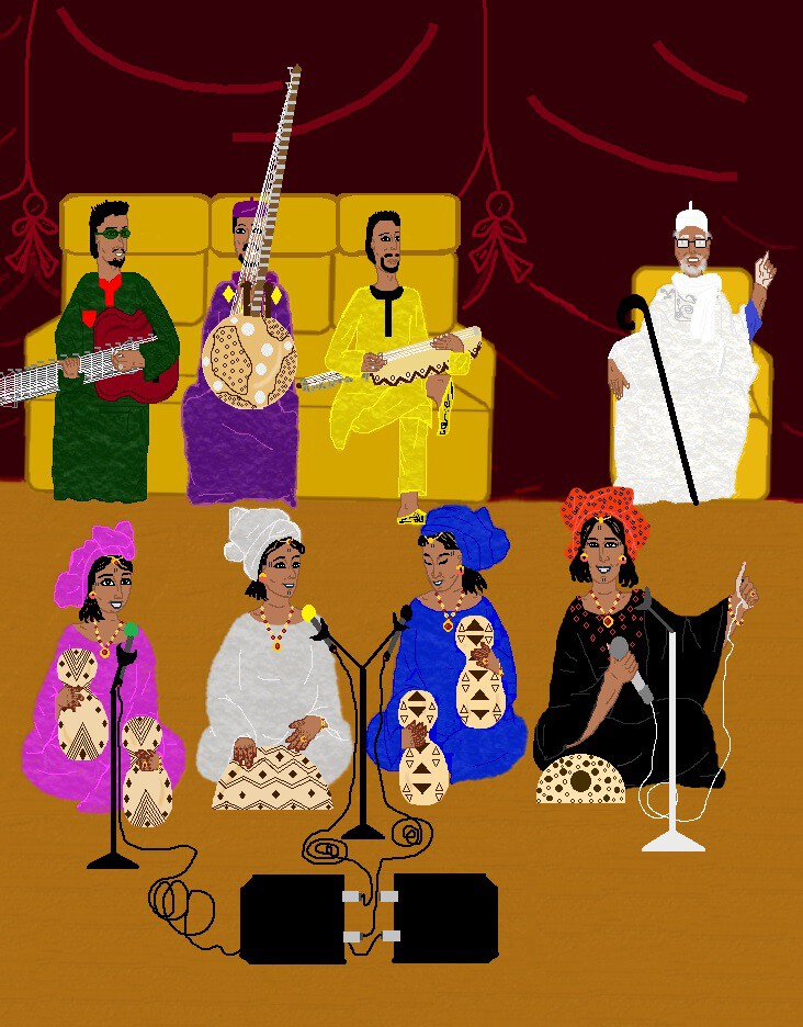 Voici, des griots, dont des femmes appelées des cantatrices chantant en cœurs, en suivant leur lead vocal (celle en boubou noir), d'autre côté, des hommes rythmant les chants avec leurs instruments traditionnels, et à droite, un patriarche griot, orateur et gardien de la tradition et coutumes des généalogies de générations anciennes célèbres dans l'histoire, bref il est le leader essentiel du groupe dans l'art du griotisme.