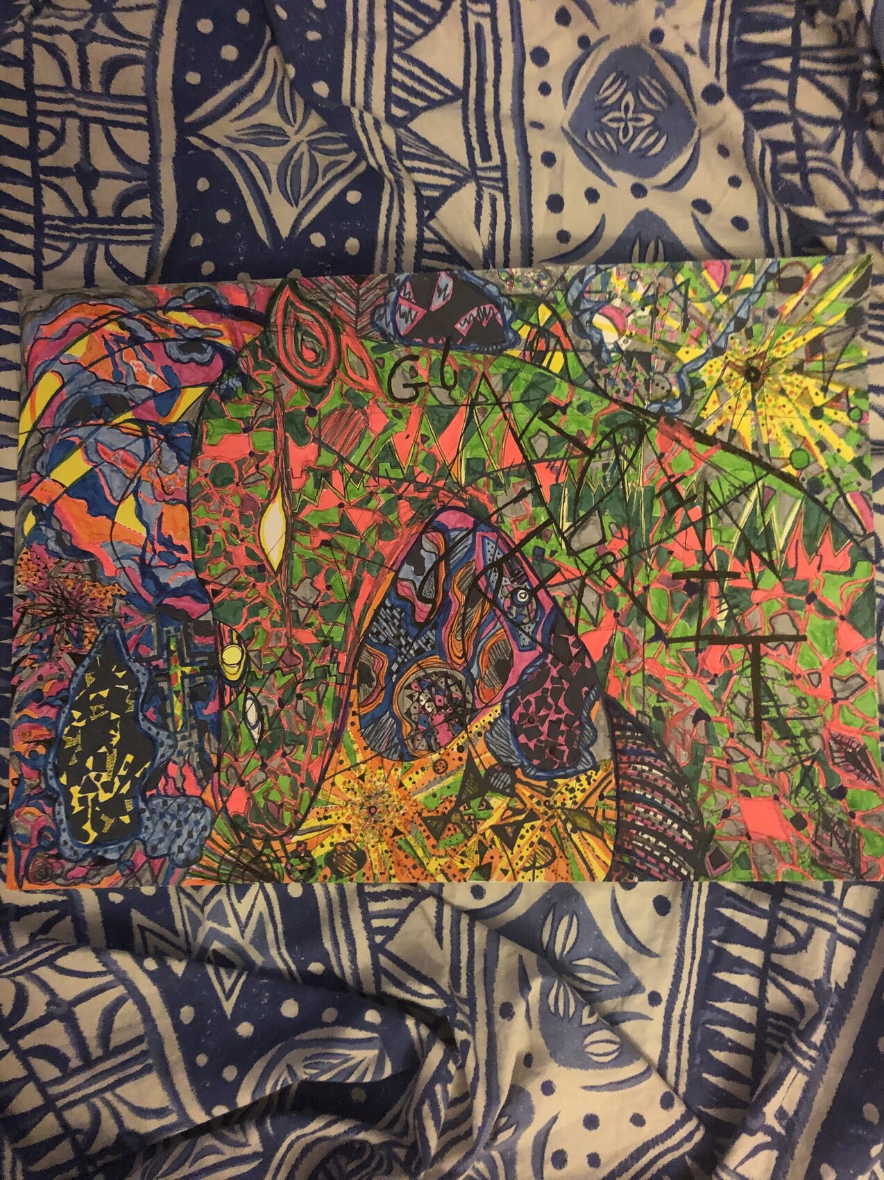 Dessin de format A3 42cmX 29,7cm. Support papier multi technique. Encre de Chine, marqueurs peinture Posca, stylos encre Micron. Juillet 2021. Cette œuvre dépeint la force intérieur, il incarne l’esprit de bataille à l’encontre des vicissitudes de la vie.