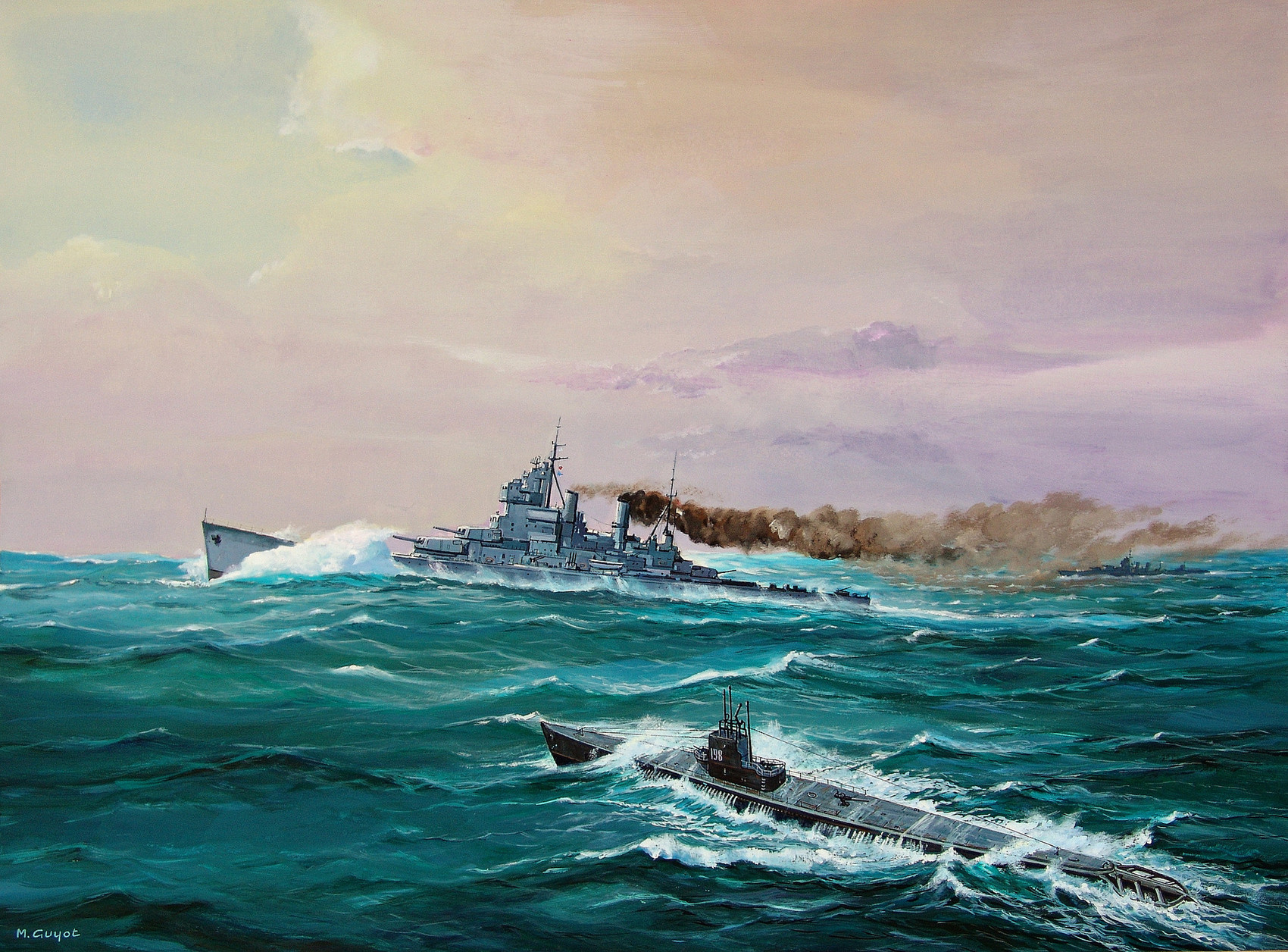 Croiseur et sous-marin US. Gouache.