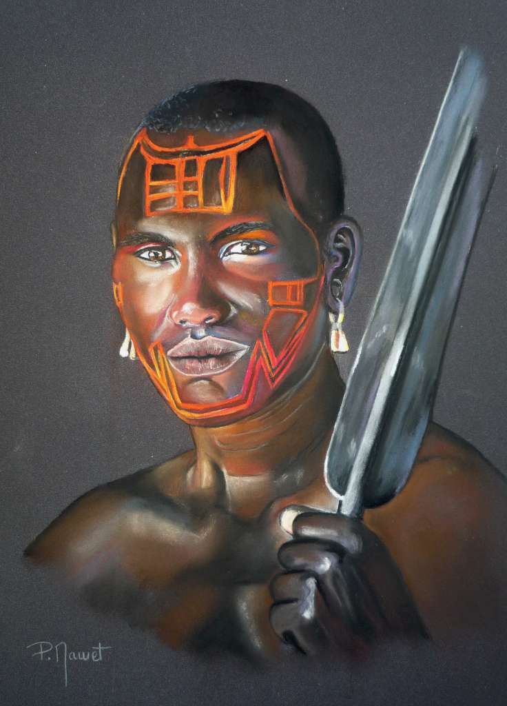Guerrier Masaï au pastel sec, d'après une photo de Jimmy Nelson avec son aimable autorisation. Dimension oeuvre 36x52 avec passe-partout 50x70.