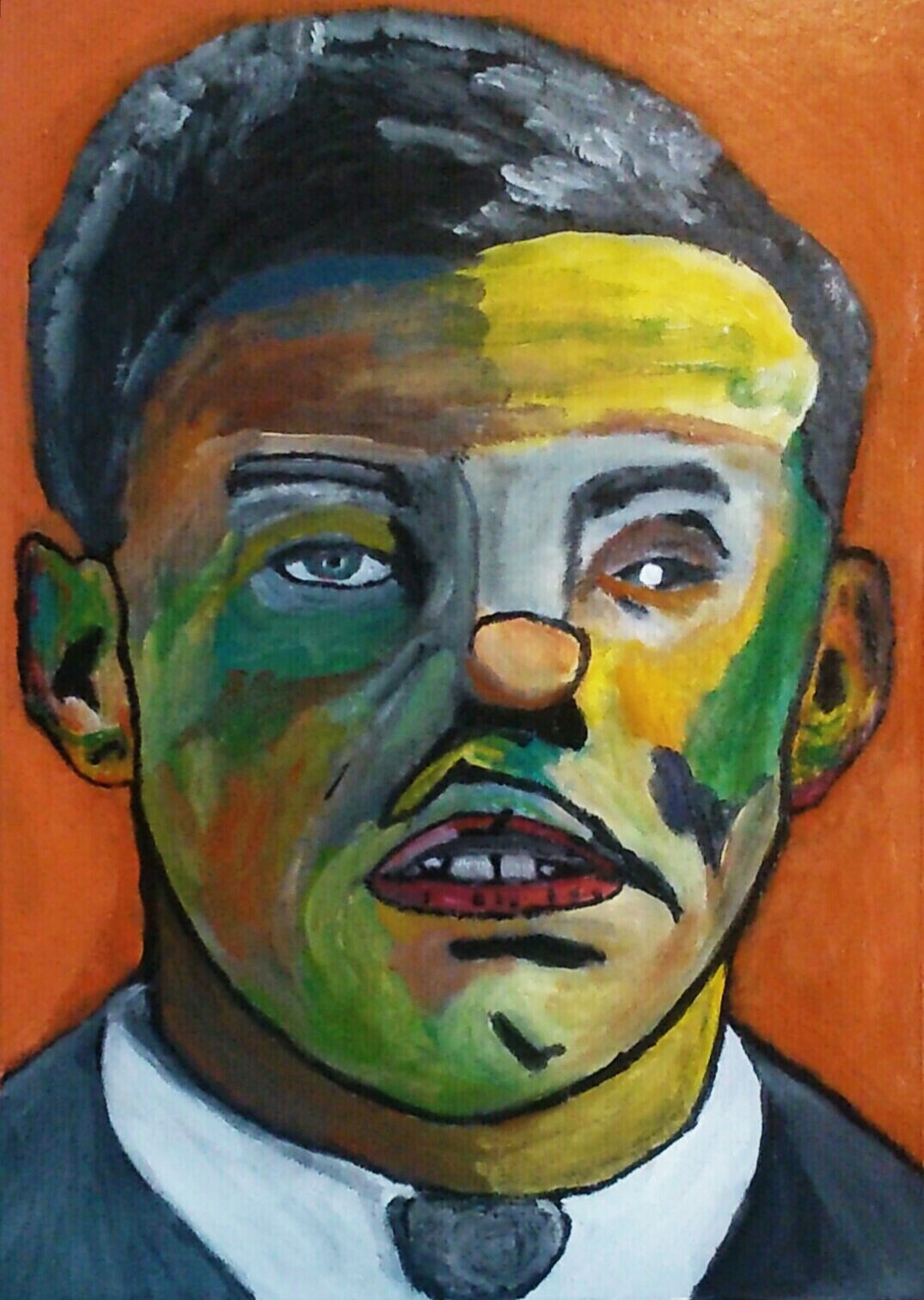 Gueule cassée IV. Acrylique, toile carton 30 x 24 cm. L'expression « les gueules cassées » désigne les survivants de la Première Guerre mondiale ayant subi une ou plusieurs blessures au combat avec des séquelles physiques graves, notamment au niveau du visage. https://www.artpal.com/cothy-art1