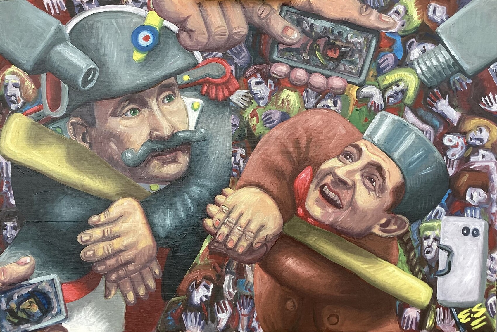 bonjour :) alors elle en est où cette guerre ? car voyez vous , depuis que je boycotte les infos ( ce qui est très difficile car elles se faufilent partout ! :)) et bien j'ai l'impression que le monde va bien ! :) vous vous rendez compte des méfaits des médias ! :)) ça devrait être interdit comme tout ce qui est nuisible :)) il n'y a que les médias qui adorent les guerres et tous les malheurs sur terre puisque c'est leur gagne- pain :)) mais quand même .. quel sale boulot de commenter la guerre en direct autour d'une table.. mais bon .. ils sont très bien payés pour ça .., ça les encourage pour rabâcher ce qu'il faut rabâcher... pour vos guignols , c'est bien Zelensky à droite ? :) votre peinture est toujours au top ainsi que votre cadrage typique à vos peintures :)