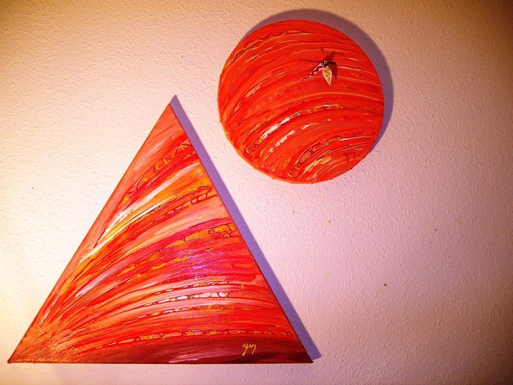 CE QUI EST LE PLUS DIFFICILE A ATTEINDRE EST TOUJOURS LE PLUS DESIRABLE . Acrylique, composition de 2 toiles sur chassis. pinceau+spatule. triangle isocèle L=50cm, Rond diam 30cm pendule intégrée dans le cercle.