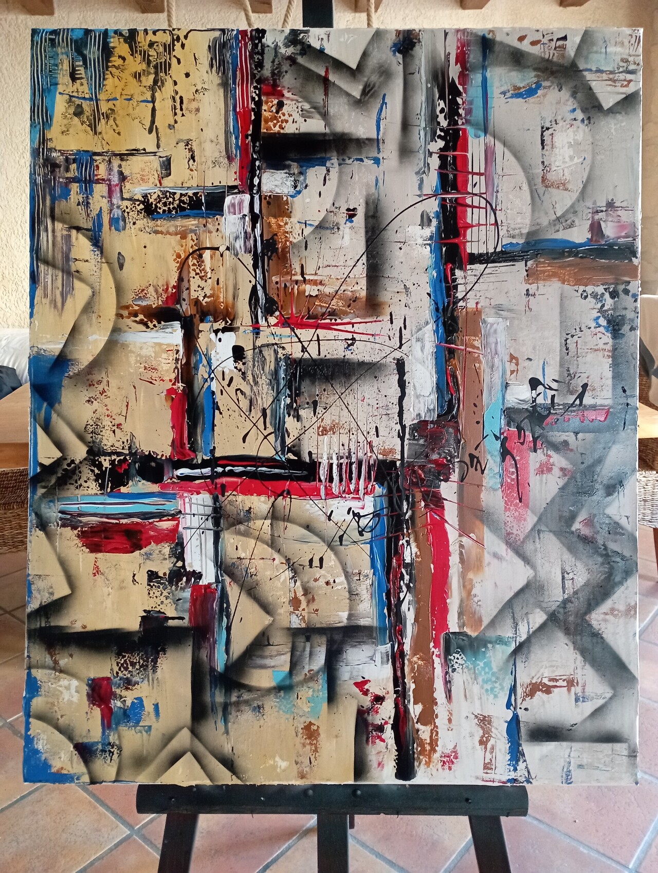 Peinture acrylique technique mixte couteau pinceau bombe acrylique, format 100x81cm