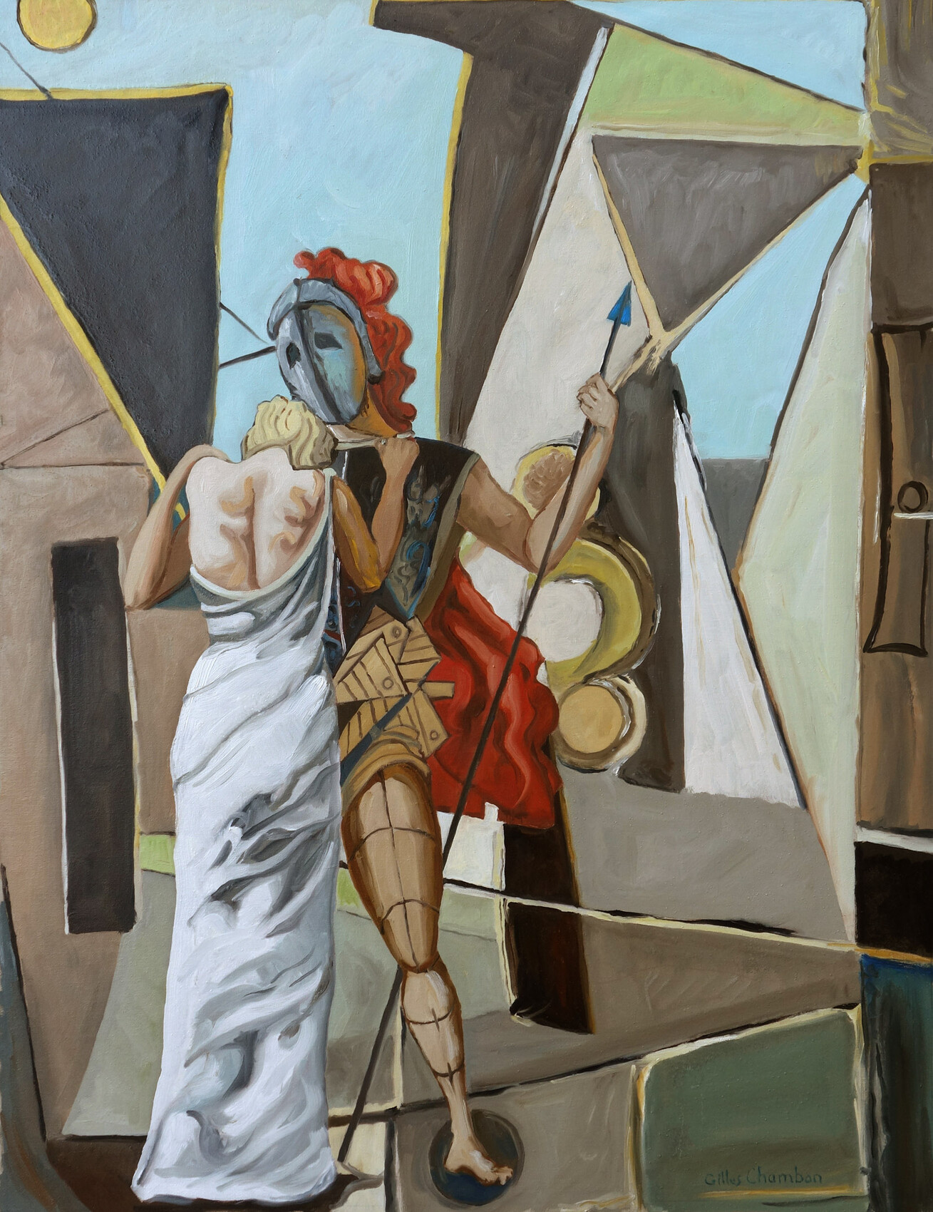 HST 65 x 50 cm, 2020. Pendant la guerre de Troie, Hector doit affronter Achille. Il sait qu’il va périr dans ce combat et serre Andromaque une dernière fois dans ses bras. Pour cette œuvre synchronistique, j’ai emprunté le couple à un tableau de Giorgio de Chirico, l’aspect « mannequin » sans visage d’Hector traduisant bien le statut de marionnette du héros malheureux manipulé par les dieux et victime du destin. Le décor est une réinterprétation personnelle d’une œuvre abstraite de L. Latapie.