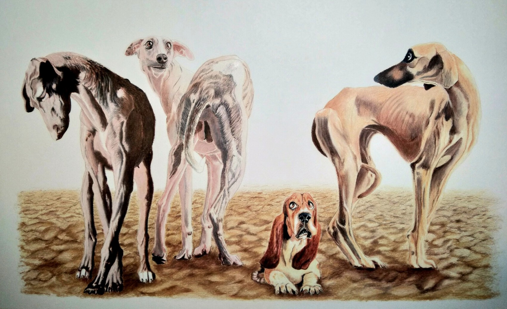 Une belle meute. Les lévriers adopteront-il le basset parmi eux ? Très joliment réalisé. Un grand bravo