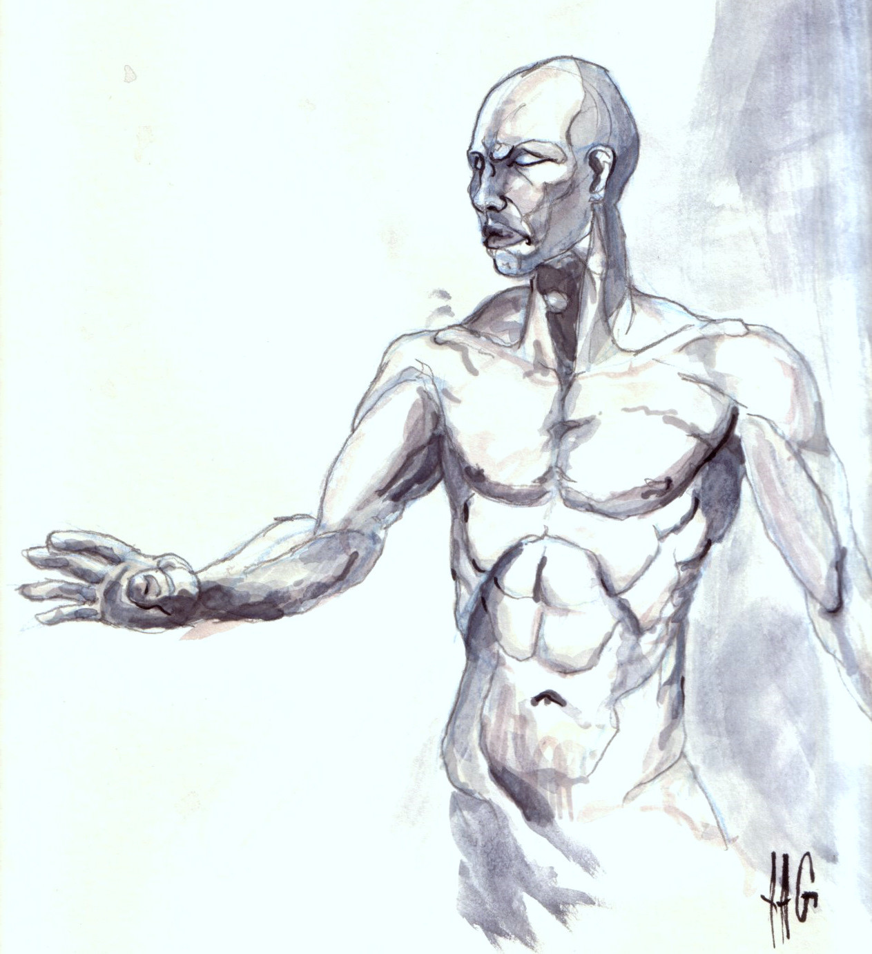 Crayon et aquarelle d'homme nu, 25x25 cm sur papier blanc 170g/m