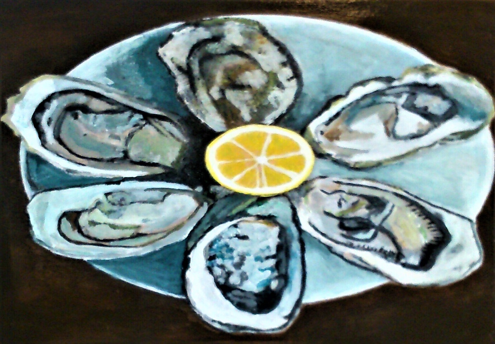 Hello, Thierry. Quant à moi, je n'aime pas les huîtres. Mais je reconnais qu'elles sont parfaitement réalisées. Une superbe assiette où le citron leur volerait presque la vedette. Bravo pour cette acrylique qui va en régaler plus d'un. Gros bisou.