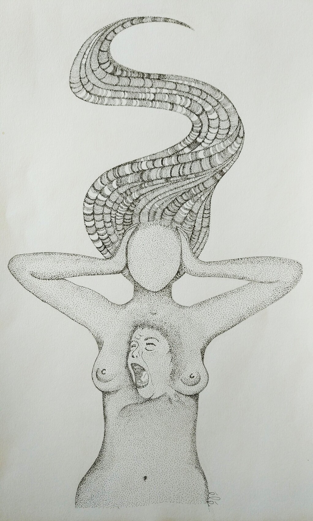 Quand on fait tout notre possible pour ne pas écouter ce que notre corps / cœur nous dit. Quand on préfère se boucher les oreilles en fermant les yeux, pour ne pas entendre à quel point ça hurle à l'intérieur. Cette œuvre représente une femme, les mains sur les oreilles : elle fait ce qu'elle peut pour ne pas percevoir les cris de son enfant intérieur, ou du moins, elle refuse de l'écouter. Elle ne possède ni bouche ni yeux : c'est un déni total de ce qu'il se joue au dedans d'elle-même, à t