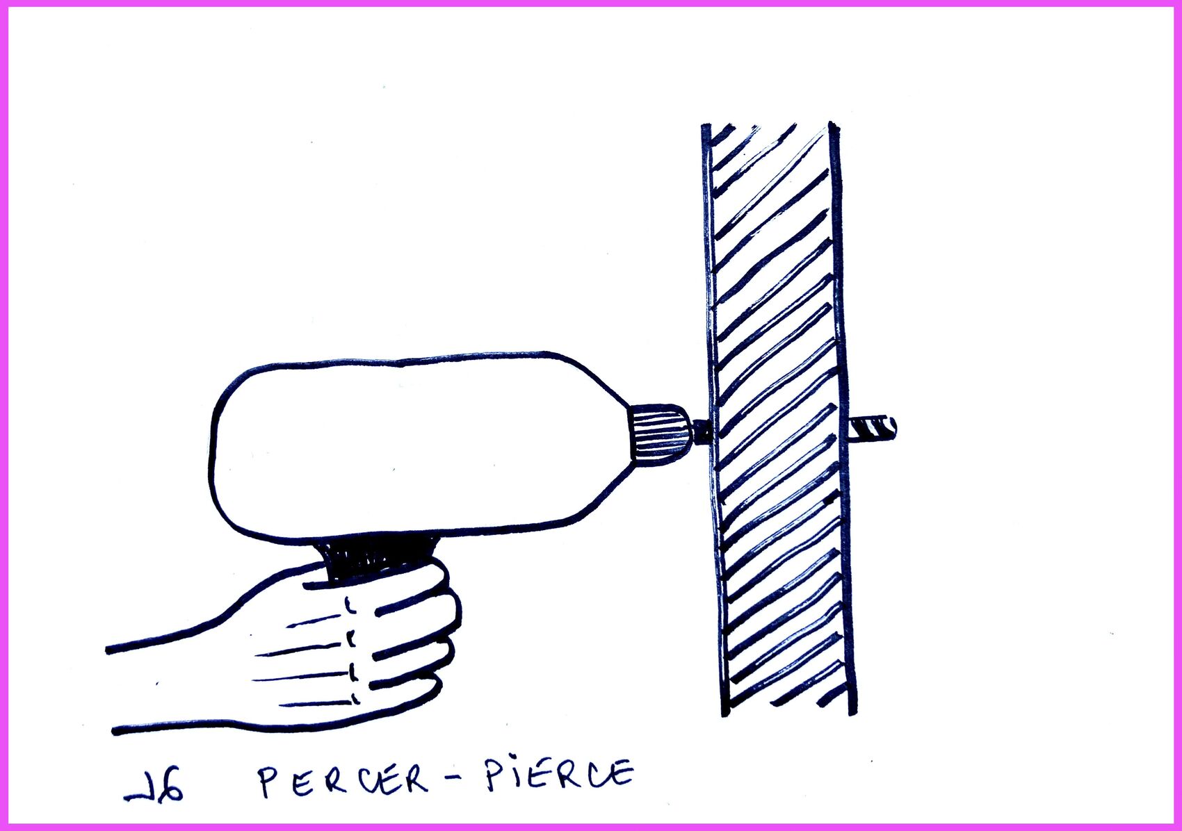 Encre, septembre 2025, 15 x 20 cm. 1ère idée, une perceuse traversant un mur = Muriel Reulet = Ink, 2025. First idea: a drill going through a wall.