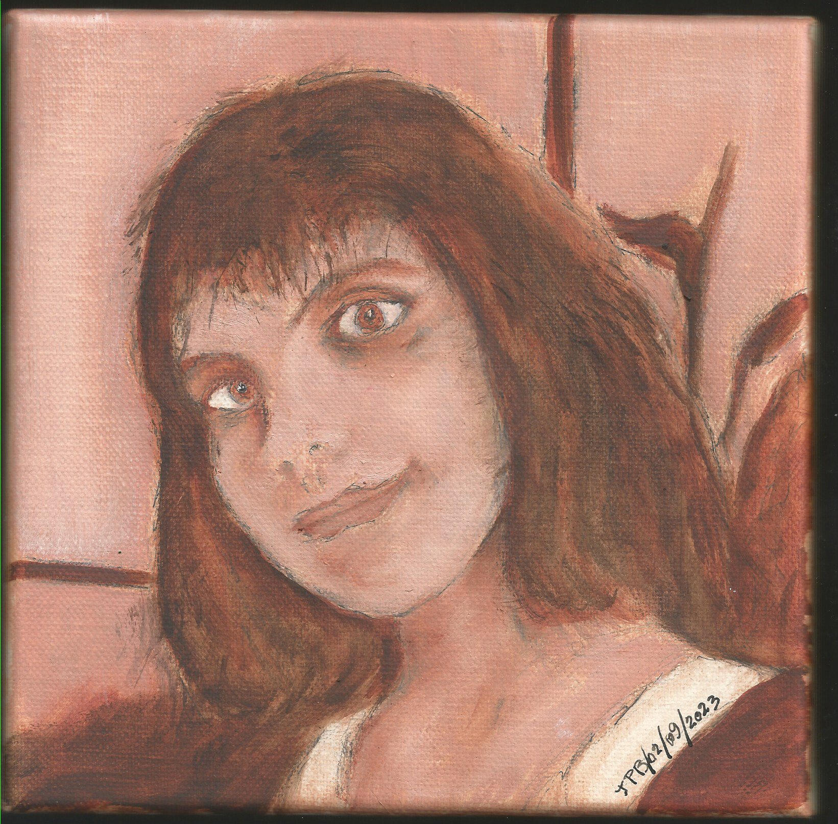 bonjour, monochrome sepia de ma petite fille isabeau, huile sur toile chassis 20X20