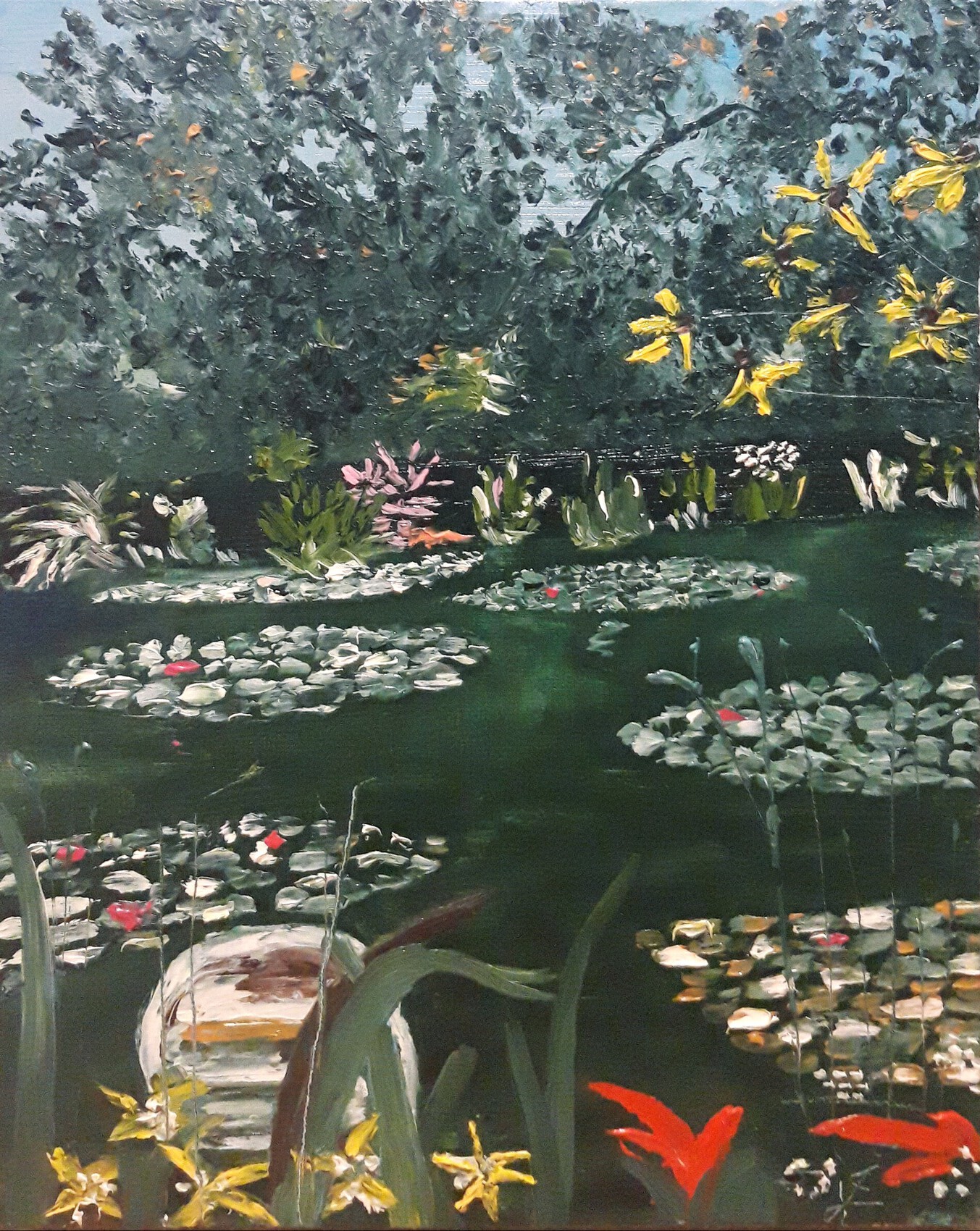 Oeuvre unique sur toile de lin (41×33×2cm). Peinture figurative à l'huile. Représentation du jardin de Monet à Giverny. 2020. Par Justine de Meerschman.