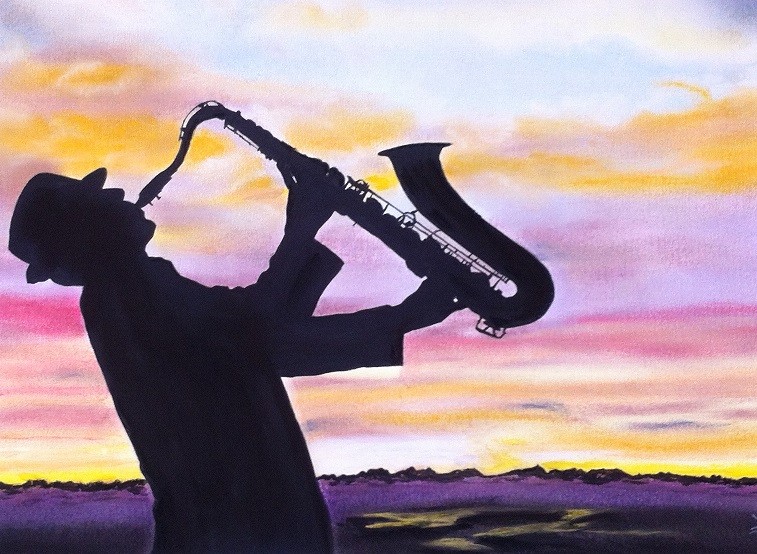 Belle gestuelle du jazz man en ombre chinoise, sur un fond joliment pastellisé.
