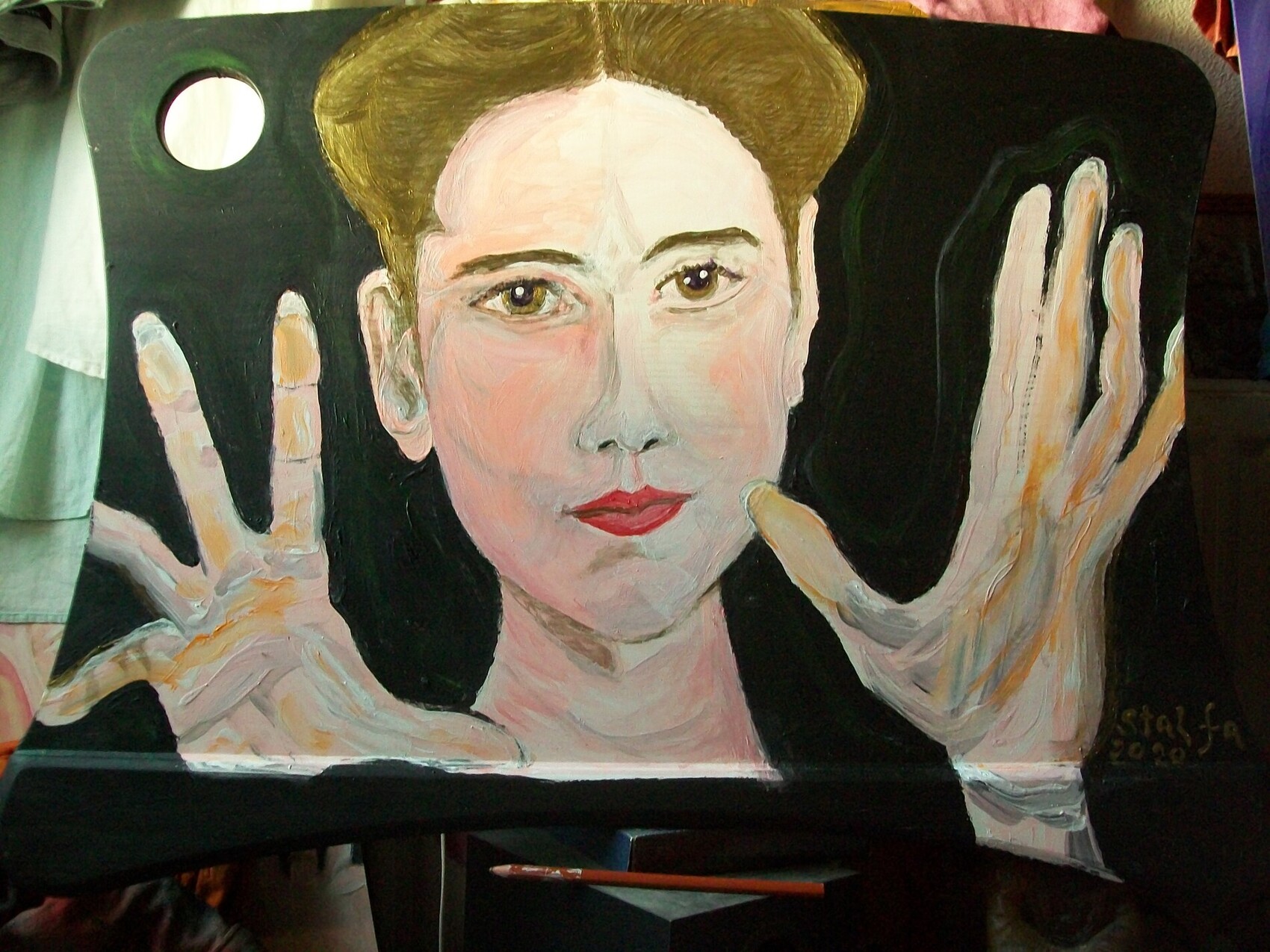 " Our future was in your hands ... " Ins . by Jennifer Connelly ... " Notre avenir était entre vos mains ... . Acrylique sur plateau de bois , table d'écolier pour enfant de 60 cm par 50 cm par 1, 5 cm , inspirée par la jeune Déborah du film : " Il était une fois en Amérique ", (musique de Ennio Morricone ) , et de ce que pensent les jeunes à notre époque ... Peint par Stal Fa , à Montpellier le 2 decembre 2020 .