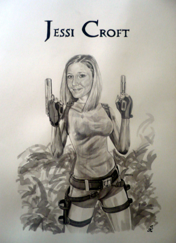 ce portrait sera offert à une amie (Jessica) sur le thème de Lara Croft. Réalisé à l'encre, pastels secs et crayons.