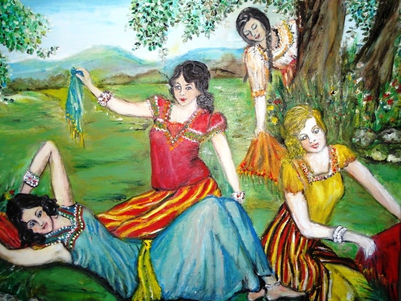jeu du foulard Huile sur toile Format 50 sur70.Le foulard est souvent agité comme signe d'allégresse et il scande joliment les danses en Algérie.