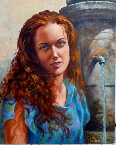 Jeune fille rousse près d'une fontaine à Tourtour. Huile sur toile de lin. 38 cm par 46 cm.