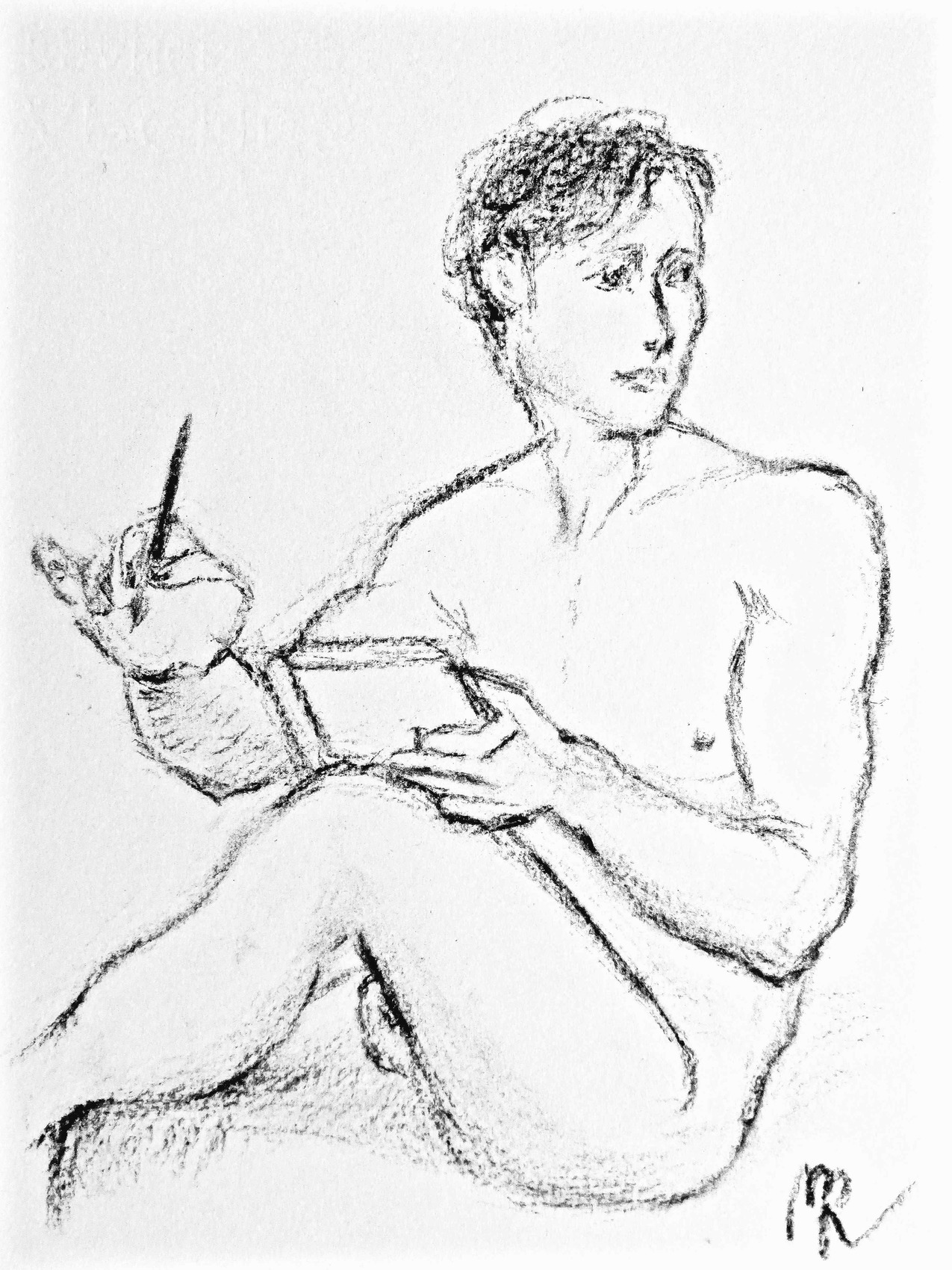 Fusain, janvier 2014, 21 X 25 cm. Dessin inspiré d'une esquisse d'Ingres. Artnaturl, PERSONNES, jeune homme assis, portrait, Muriel REULET.