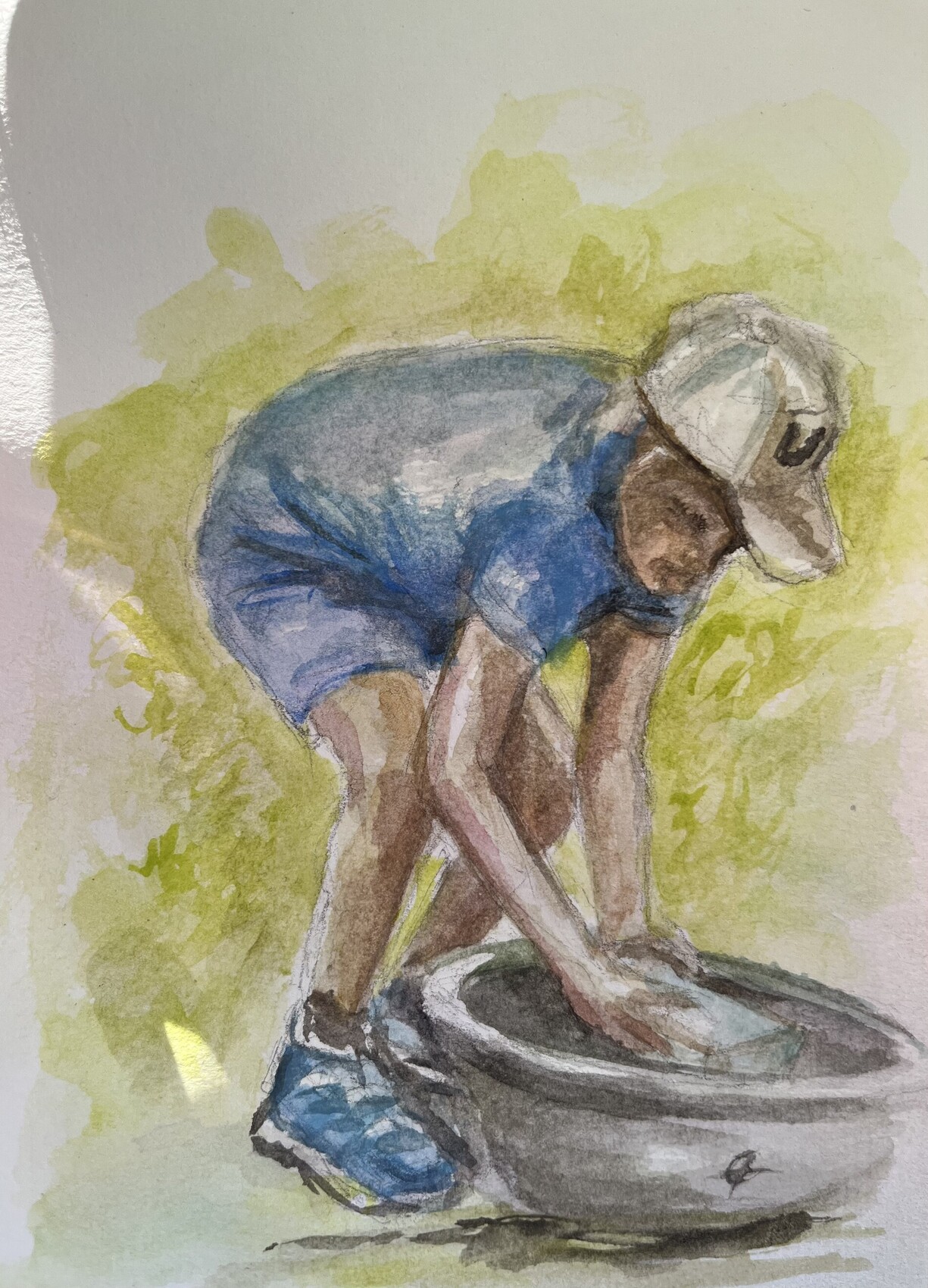 Il fait chaud ! Très chaud ! Un peut d’eau, pour un jeux d’eau ! Aquarelle rapide réalisée à l’abri du soleil sous un saule dont j’ai récupéré quelques larmes pour immortaliser ce doux moment!