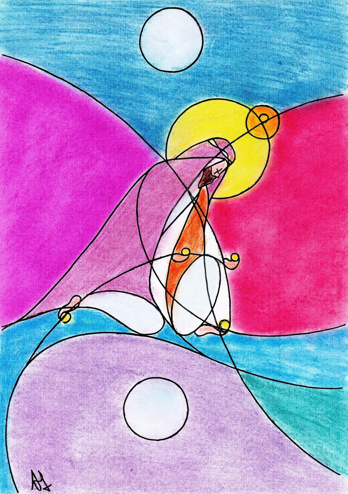 La foi c'est l'absence de doute ... ? L'humilité de sa posture à genoux lui confère les forces du soleil , de la lune et de la terre ... Merci pour ce trés beau dessin coloré .
