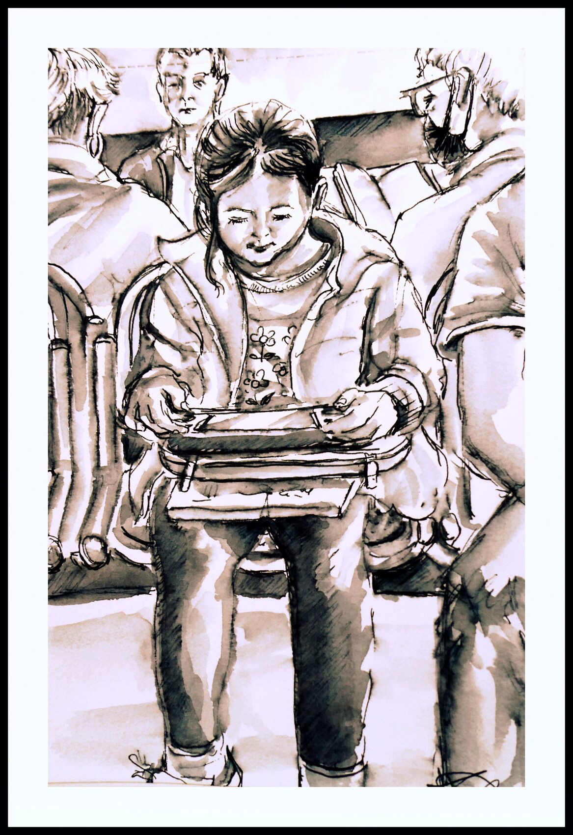 Petite scène de vie croquée avant de voir le médecin. Feutre noir et pinceau à réserve. (15x22 cms)