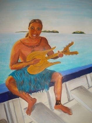 pastel gras 40 x 50 cm- 2008 en promenade à bateau à bora-bora, notre guide, s'est mis à jouer de son ukulélé. c'était magique !