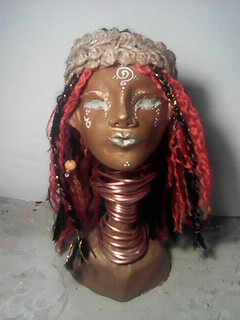 Statuette d'argile peinte, cou en bois de tilleul, chevelure laine et fil d'or, collier en cuivre. Une sorcière d'Afrique