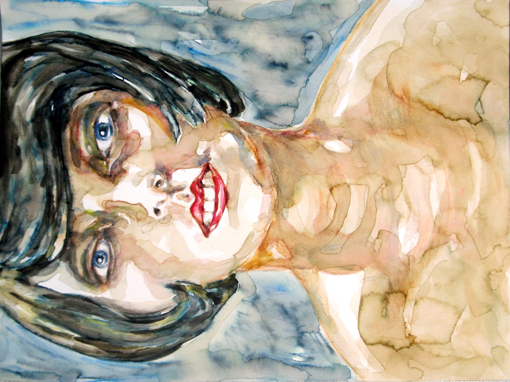 Aquarelle d'après une photographie de Man Ray. Égérie des Années Folles et compagne de Man Ray, Kiki fut l'inspiratrice des plus grands artistes de l'époque. Avec la Grande Dépression tout prit fin et la belle Kiki s'adonna aux commerces, aux drogues et...au chocolat! j'ai eu l'envie de revoir à ma façon ses beaux yeux bleus et sa bouche en forme de cœur regorgeant de rouge à lèvres. peut-être que je ne suis pas le seul...