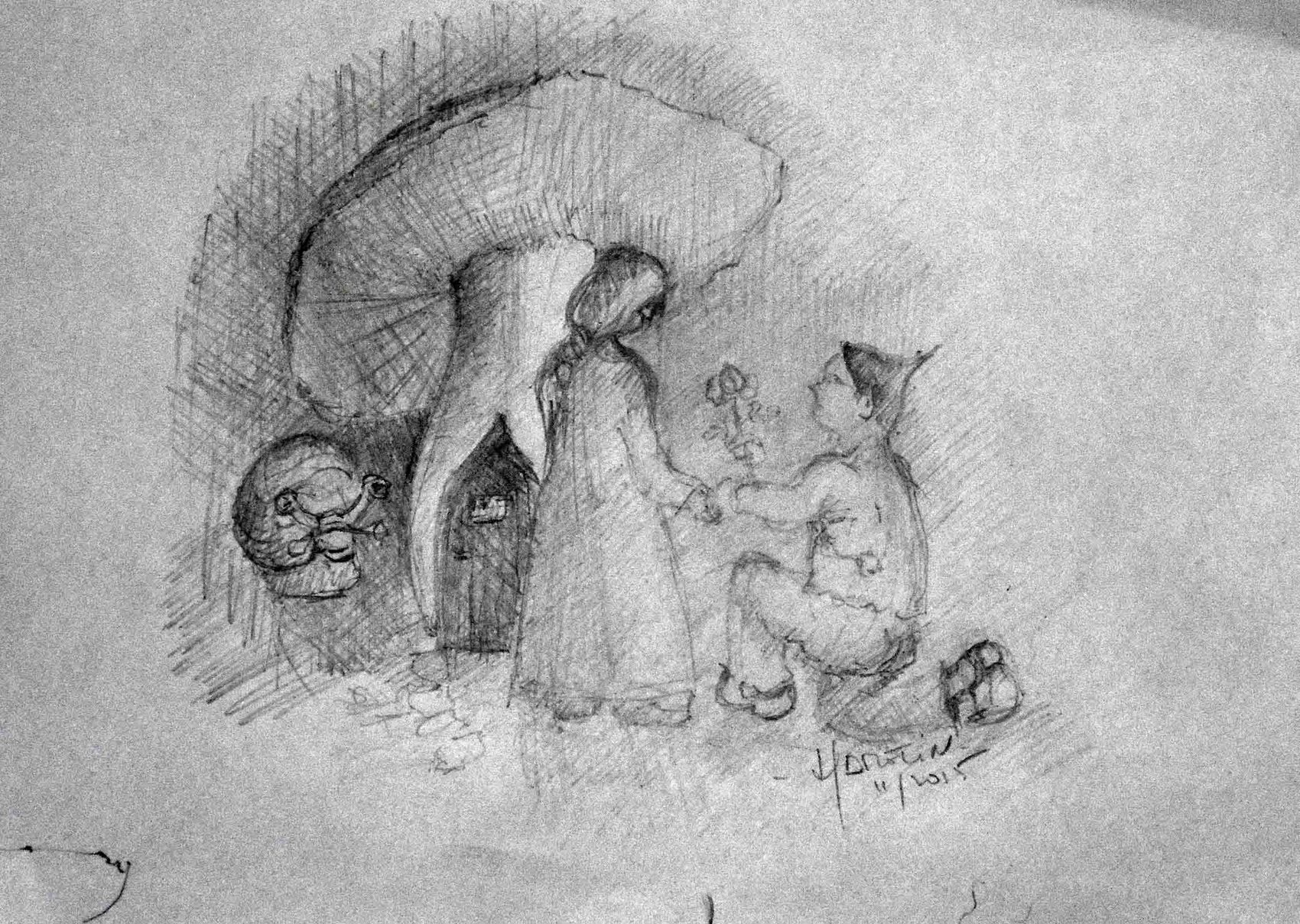 Crayon sur papier format A4 Un jeune korrigan demande sa belle en mariage, une rose à la main à l'entrée de sa maison champignon, sous les yeux intrigués d'un escargot !