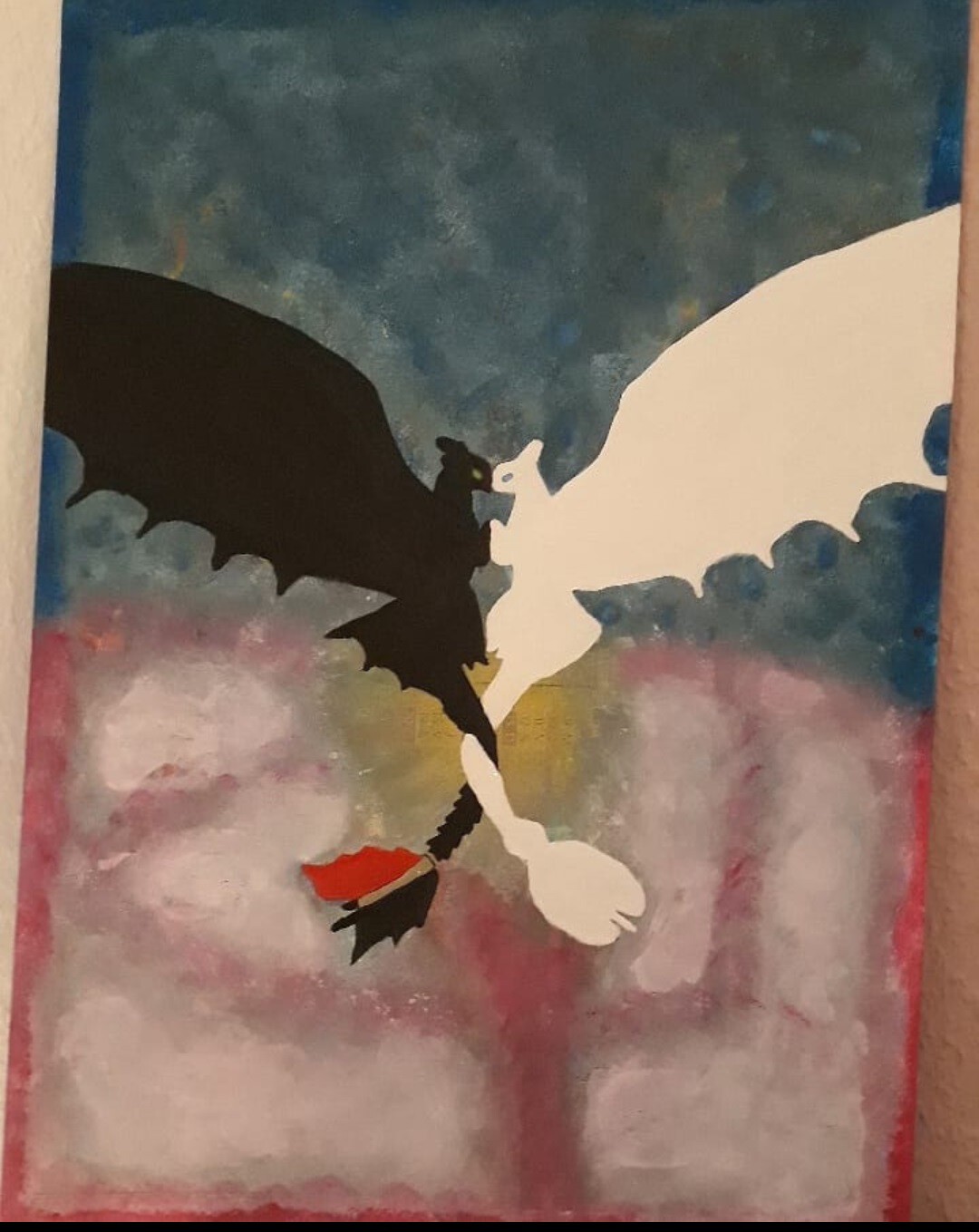 Peinture de Krokmou et de la furie éclair du dessin-animé "Dragon 3" et qui a pour support un ancien calendrier. La peinture utiliser est de la gouache.