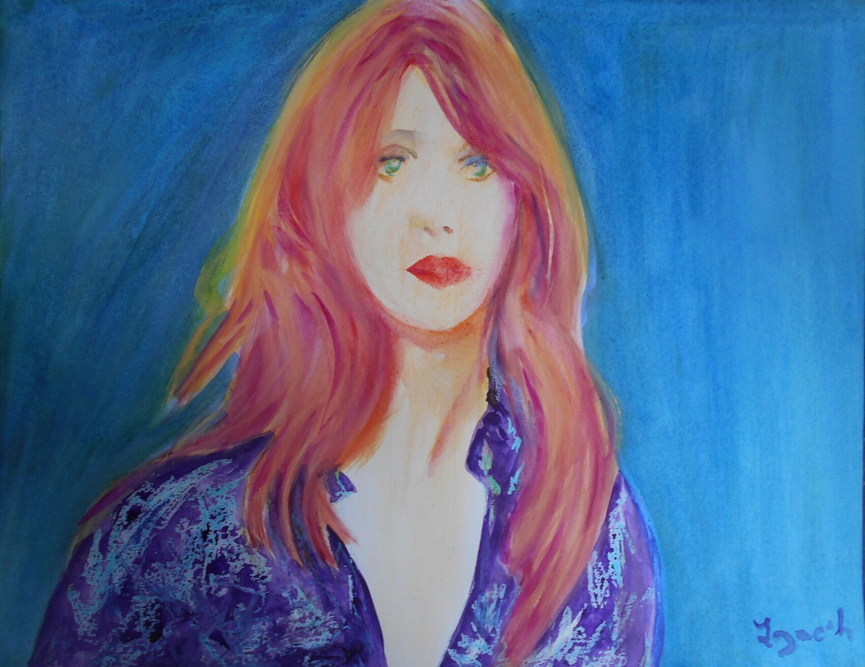 Bonjour doyen, comme vous l'avez dit, vous aimez, bien prendre, soins des cheveux, et les mettre en valeur, ainsi, dans chacun, de vos portraits, vous le faites, artistiquement, et la jolie amoureuse, qui semble perdu, dans ses pensées, et émotions, en a une belle crinière rousse brillante, dans un fond bleu océan, mélangée, aux autres couleurs bleus, beau portrait.
