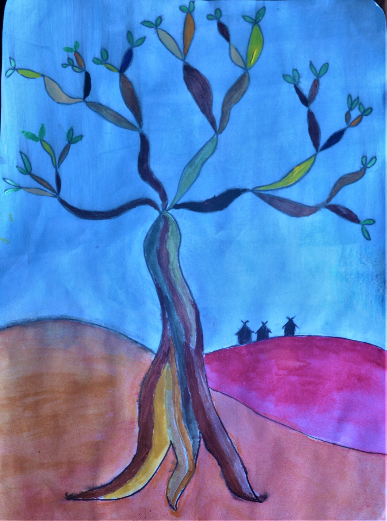 Dessin original, aux couleurs chaudes, comme si l'arbre voulait s'échapper, prendre ses jambes à son cou après avoir entendu les paroles prononcées :) Bravo. Bonne journée Antoine.