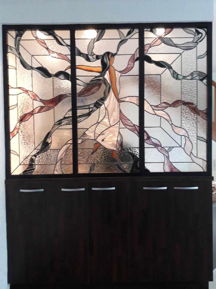 Panneaux de séparation cuisine salle à manger. En caisson bois .Vitrail et grisaille. A réaliser sur mesure