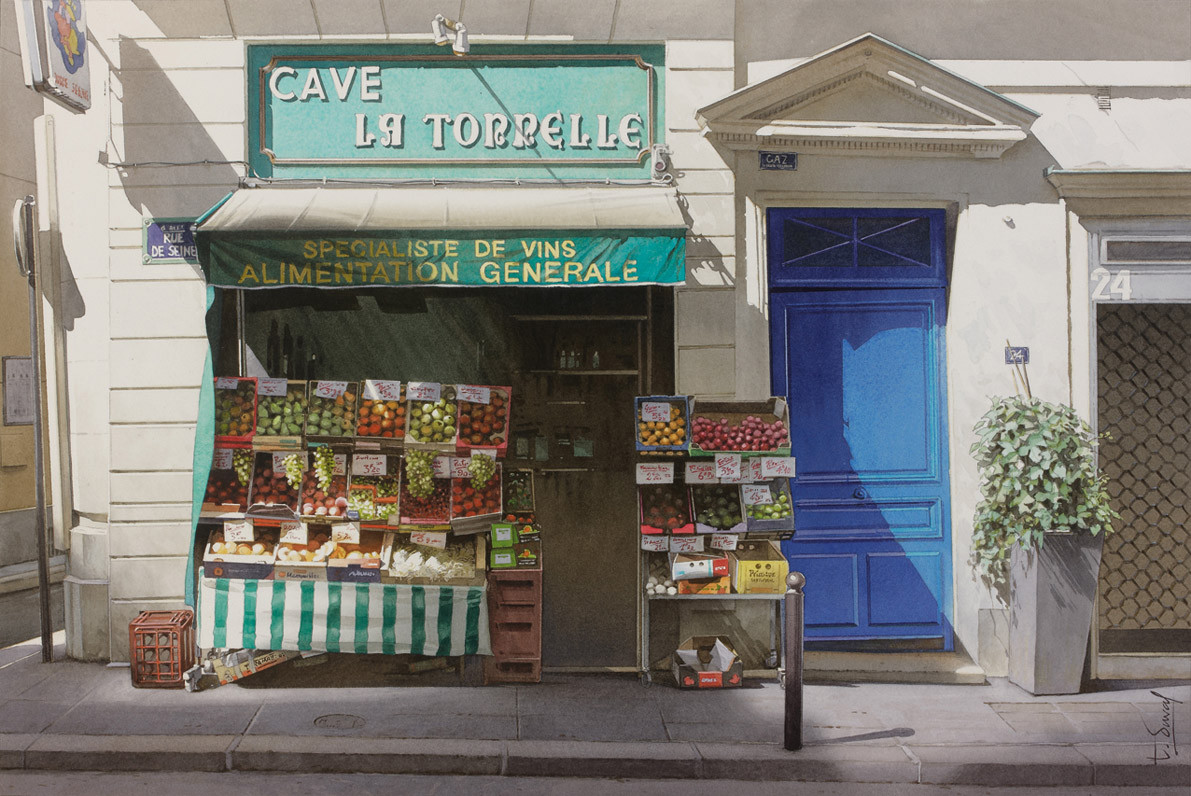 Aquarelle originale - Paris. L'épicier du coin de la rue... Encore une histoire de parfums, mais fruités cette fois ci.... Format : 53 cm x 35,5 cm. Collection privée, Galerie Suiha - Tokyo. "The grocer of the Rue de Seine" - Original watercolor - Paris. Another story of perfumes, fruity but this time .... Size: 20,9 in x 14 in. Private collection, Suiha Galerie - Tokyo.
