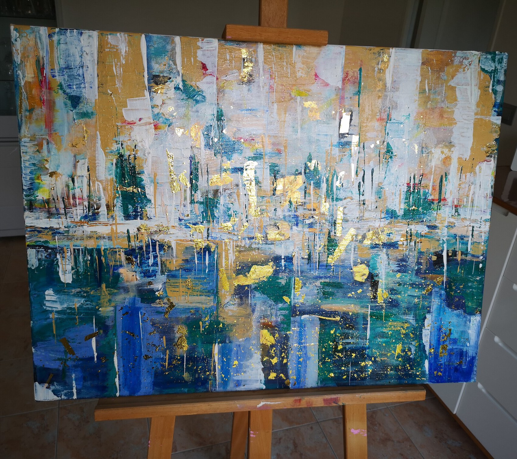 Toile acrylique 70x60. Type abstrait.. Bleu or paysage entre ciel et océan, feuilles d'or incrustés. J'ai beaucoup aimé marier l'or le bleu et les couleurs clairs pour le ciel.