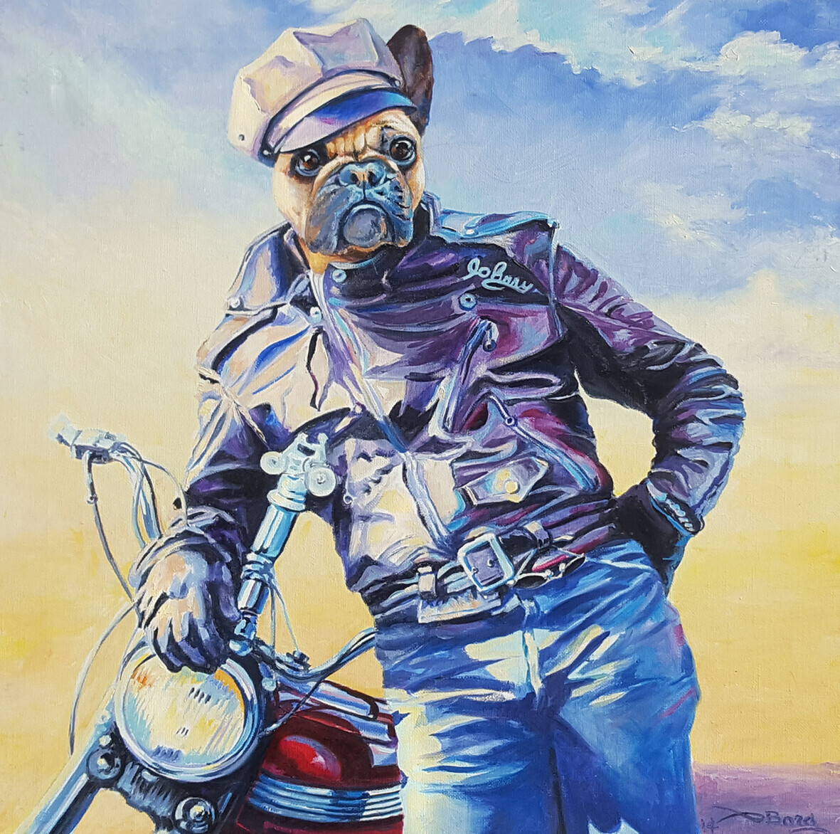Chien habillé en motard façon Marlon Brando dans l'équipée sauvage avec sa moto. Huile sur toile 50x50cm