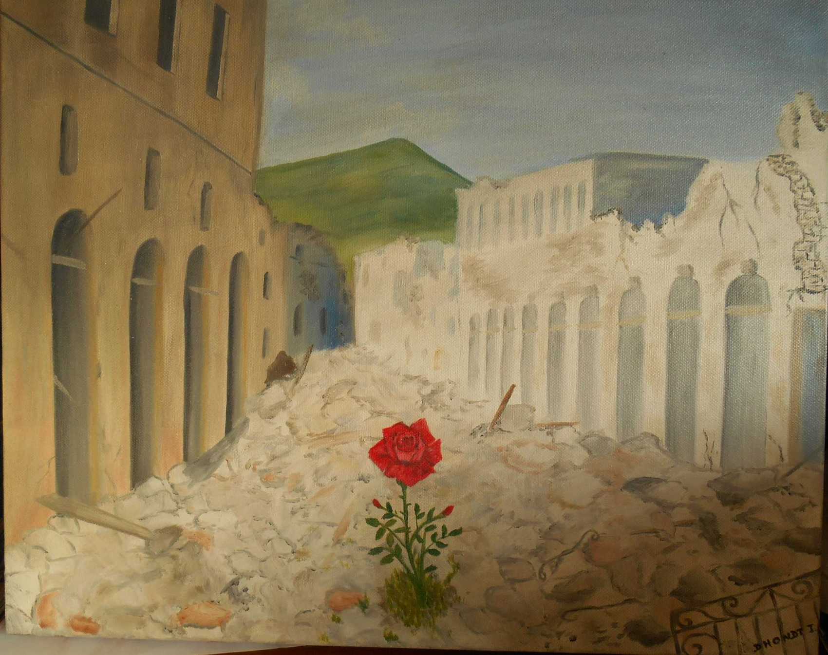 tableau peint à l'huile représentant un rosier qui pousse dans un village en ruine sur une toile de 46cm x38cm