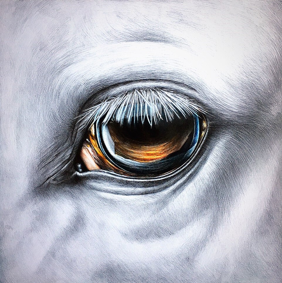 L'œil du cheval Format 50x50cm Crayons prismacolor 8h 2018 > Un travail en couleur qui dénote un peu des autres. Je cherchais la brillance de cet œil, les effets de reflet et de lumière croisés. #damienpaccalin #dessin #dessinanimal #noiretblanc
