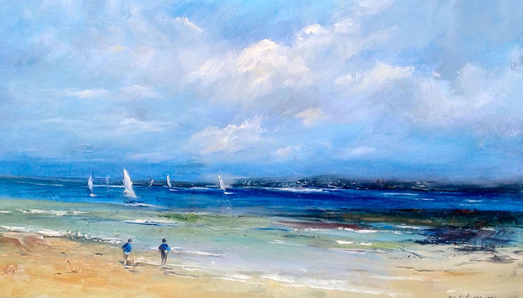 Composition d'une scène de plage de la baie de somme sur toile de lin