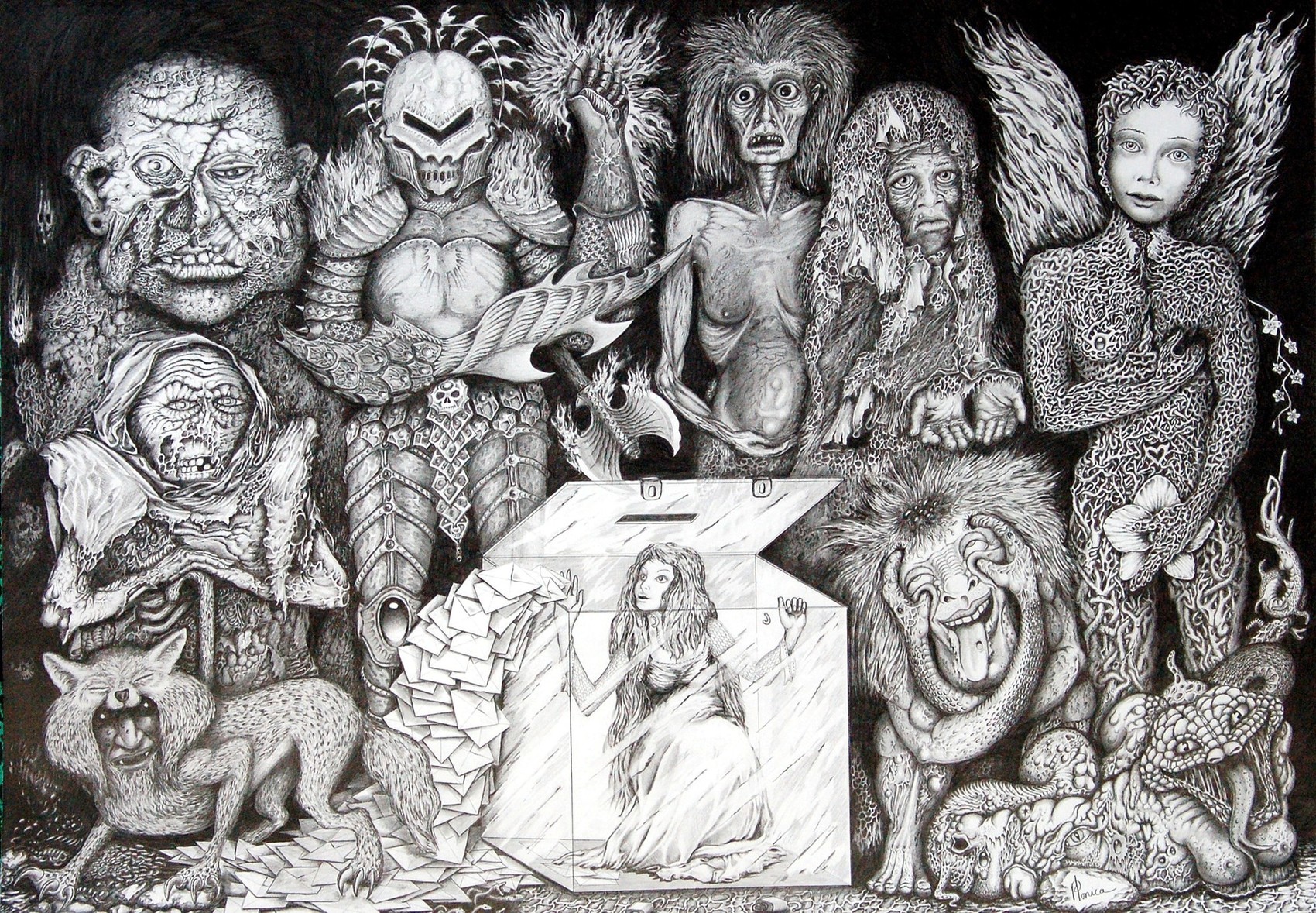 Dessin au crayon mine graphite noir sur papier bristol 50 x 70 blanc. La Tromperie, la Vieillesse, la Maladie, la Guerre, la Famine, la Misère, la Passion, la Folie et le Vice sont sortis de la boîte de Pandore, seule l’Espérance, plus lente à réagir y resta enfermée.