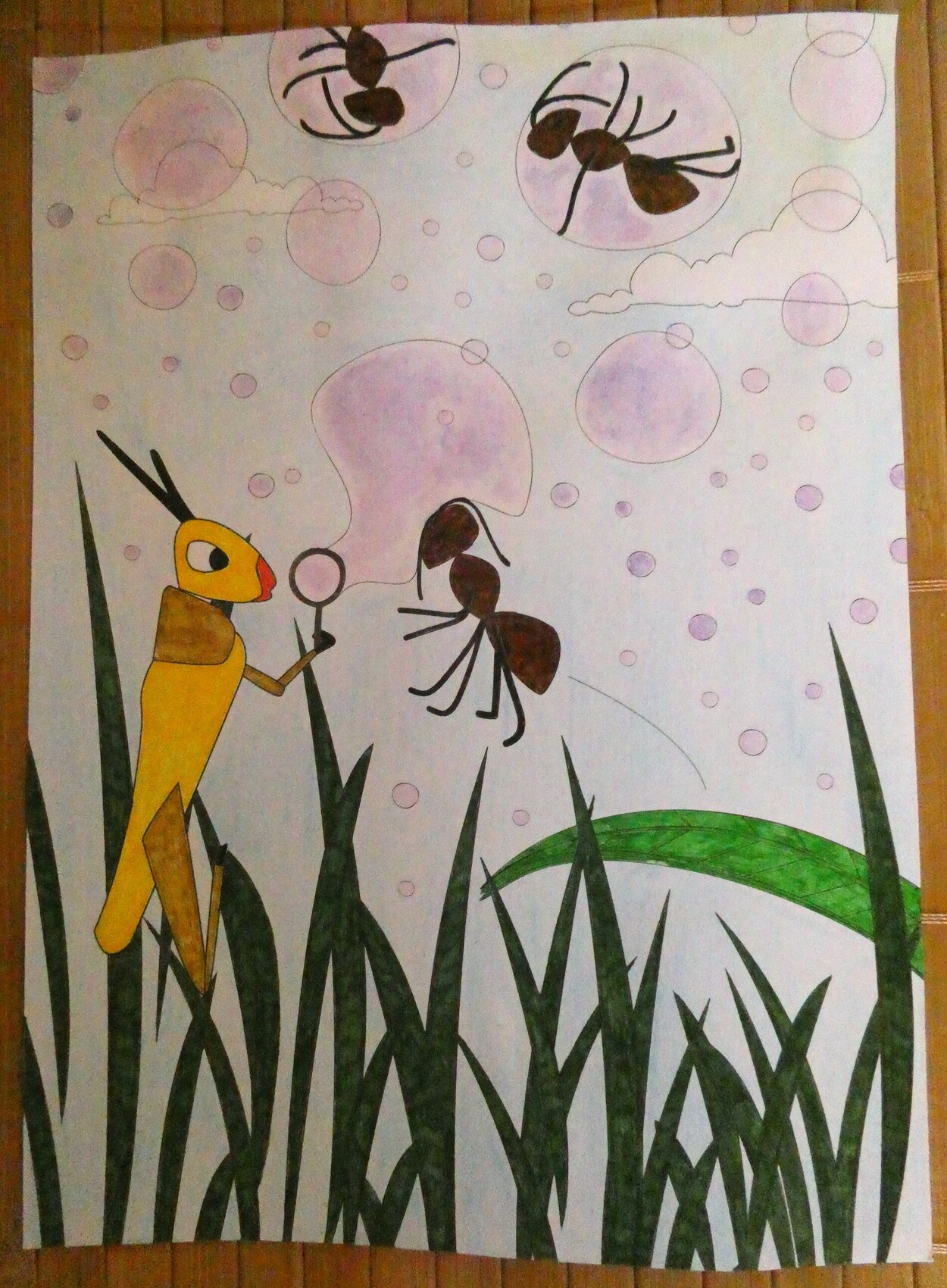 J’ai colorié ce dessin de Stéphanie Brepson tiré du carnet de coloriage Jardin mystérieux. Je l’ai intitulé La cigale et la fourmi, en référence à la fable de la Fontaine. En réalité, l’insecte représenté à côté de la fourmi est plutôt un criquet ou une sauterelle. Il est réalisé au feutre et les bulles sont à l’aquarelle.