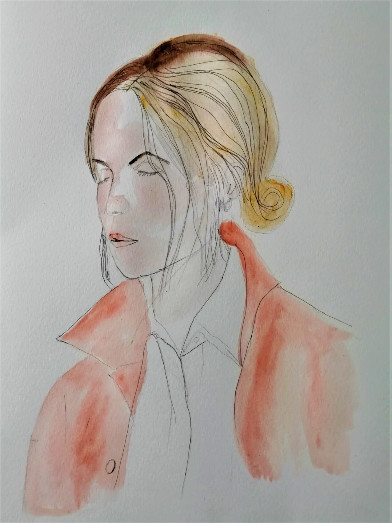 Tout en finesse, peu de traits, peu d.aquarelle , une personne frêle.