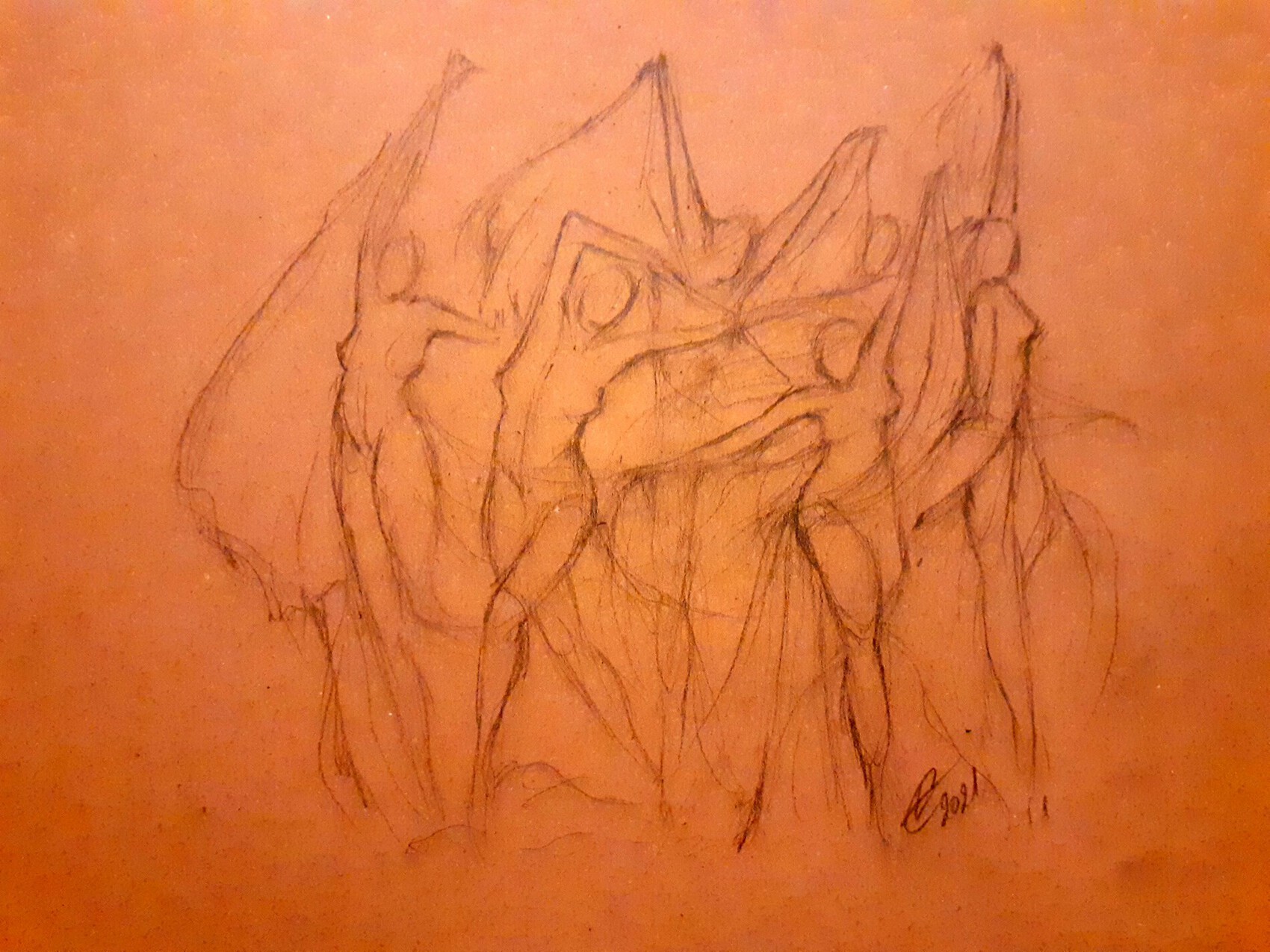 Ce n'est pas par la danse que je dois vriller !!! Il s'agit d'une réflexion sur le pouvoir de la séduction qui peut vite passer de la séduction au meurtre comme dans l'histoire de Salomé qui par sa danse a réussi à obtenir la tête de Jean Baptiste par un plan diabolique organisé en arrière plan. Aujourd'hui encore ne nous laissons pas séduire par de vain discours mais soyons vigilants et attentifs. Bien plus qu'une parole, une mise en garde.