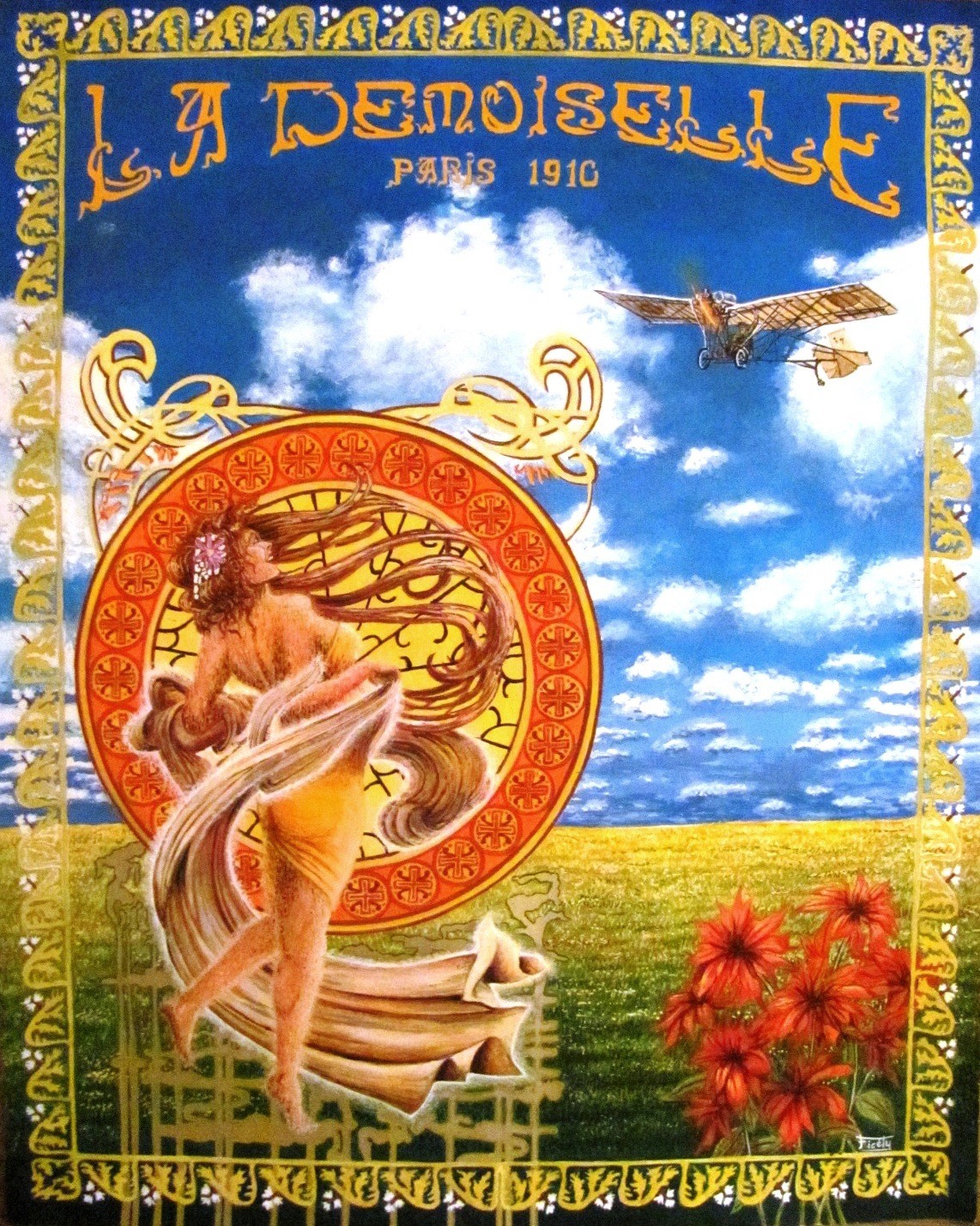 Paris 1910: une charmante demoiselle regarde approcher une autre Demoiselle, le frêle et délicat avion de Santos-Dumont, pionnier de l'aviation. Quelle jeune fille n'a pas rêvé de voler auprès d'un de ces casse-cou de l'époque ? De style Art nouveau, cette gouache mélange aussi l'hyperréalisme de l'arrière plan avec l'impressionnisme de la demoiselle spectatrice du premier plan.
