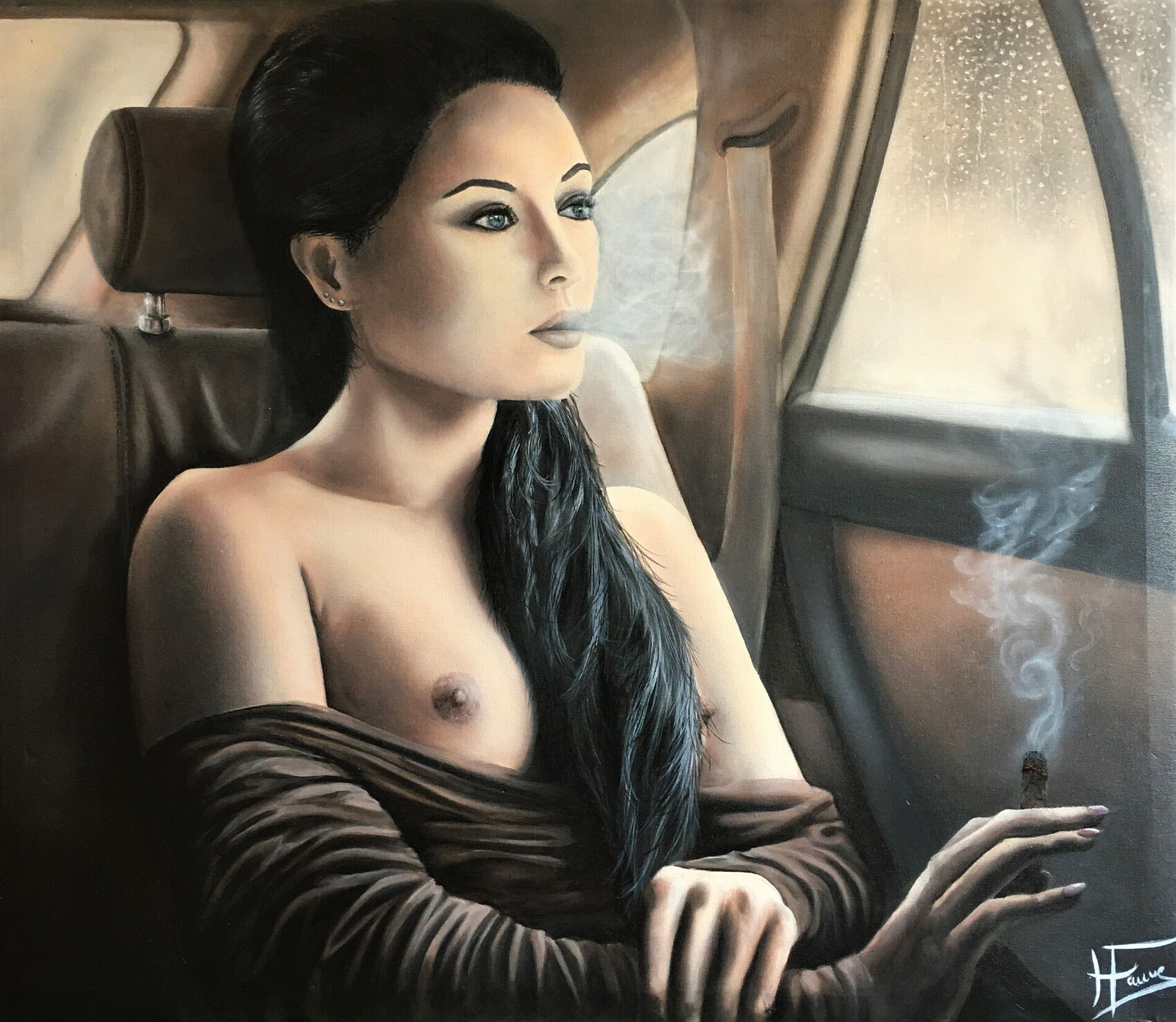 78 x 65/ Seule assise à l'arrière dans sa luxueuse voiture, elle regarde au delà, regard perdu au dehors... La pluie sur la vitre ne gêne pas ses pensées qui vagabondent... à quoi pense-t-elle? Le cigare est un réconfort, mais elle est malheureuse ? triste? pensive? soucieuse?